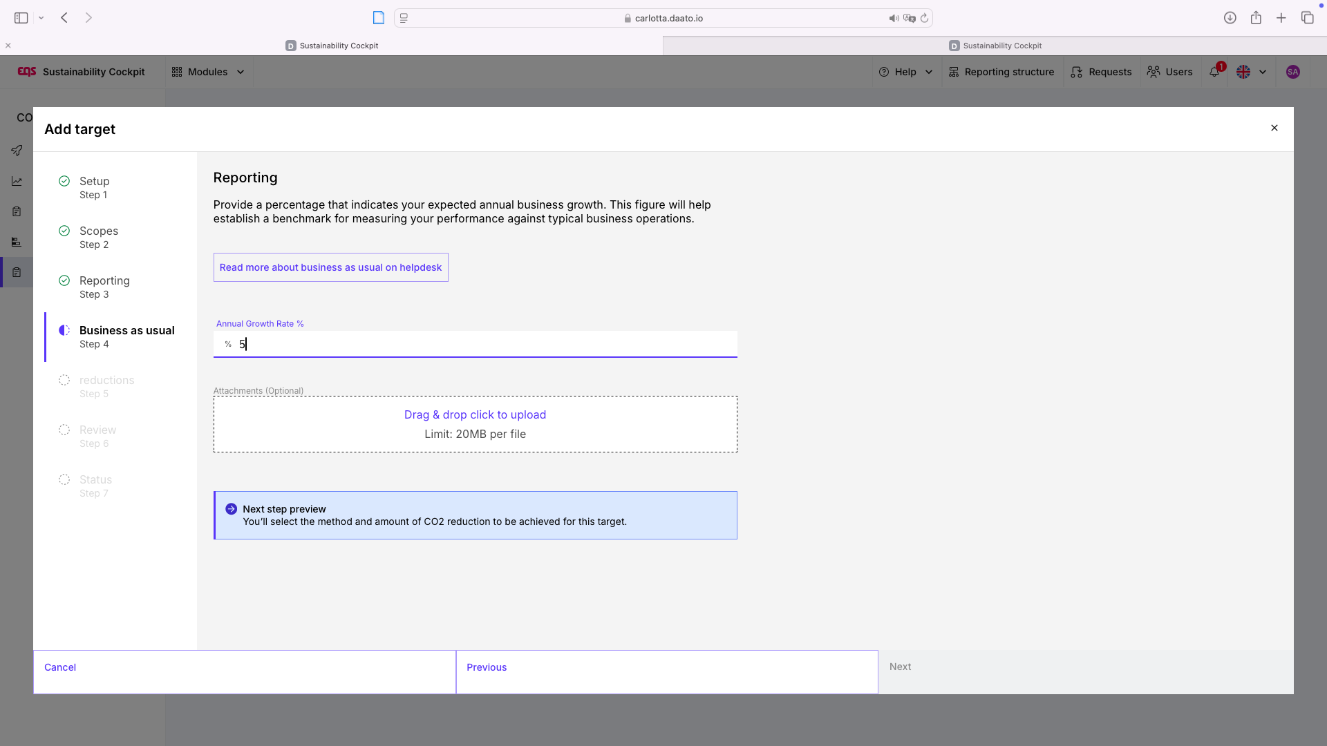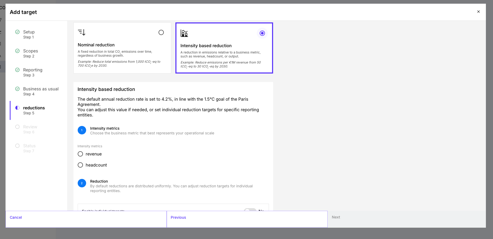 Im Reduktionsplaner erfolgt die Zieldefinition strukturiert in mehreren Schritten. Dabei werden nicht nur Zielwerte festgelegt, sondern auch die relevanten Systemgrenzen, Annahmen und Berechnungslogiken definiert. Wenn sie einen Reduktionsplan Anlegen, setzen Sie in diesem Prozess ein Ziel. Anschließend können innerhalb eines Reduktionsplans weitere Ziele hinzugefügt werden.