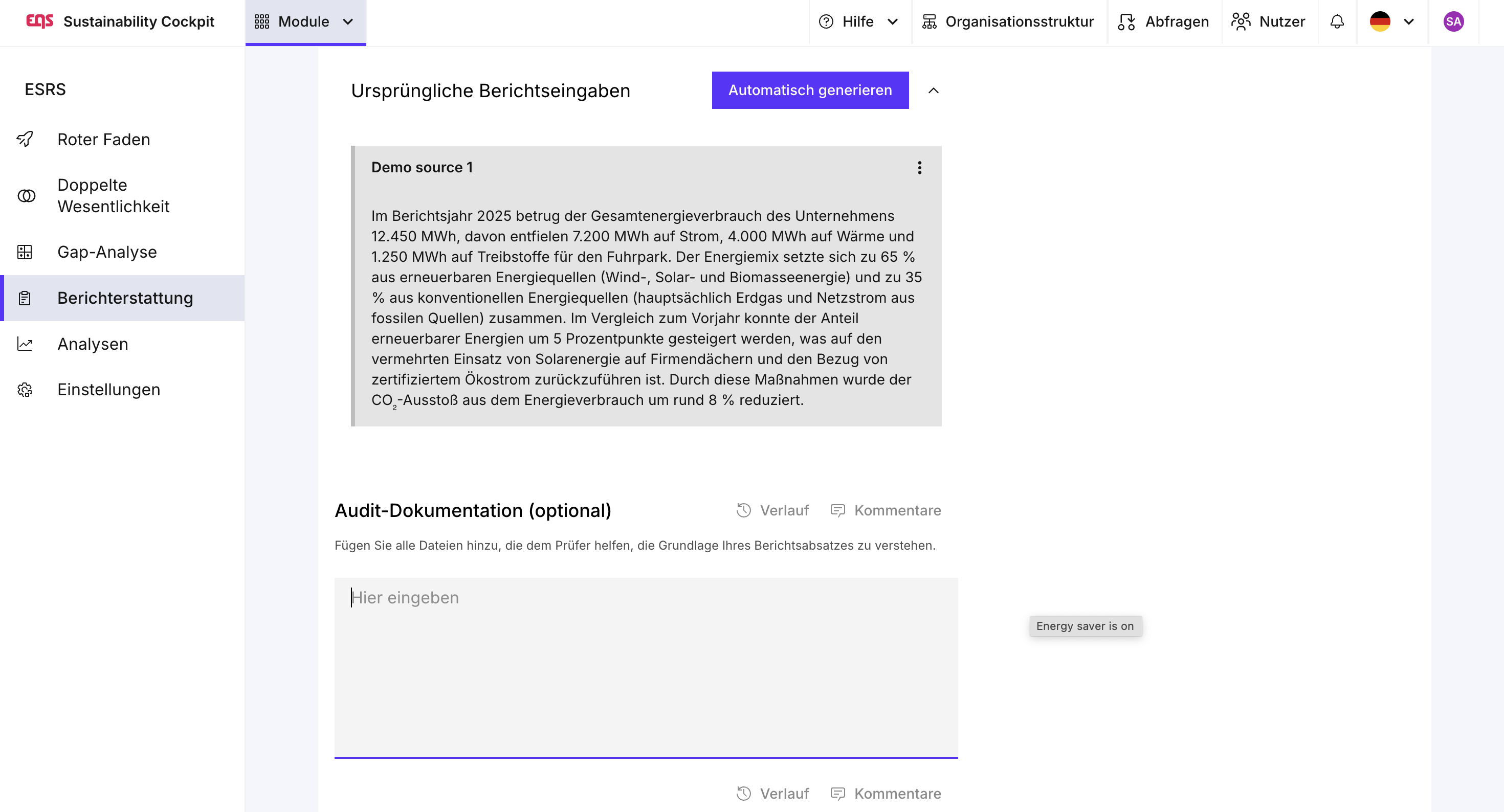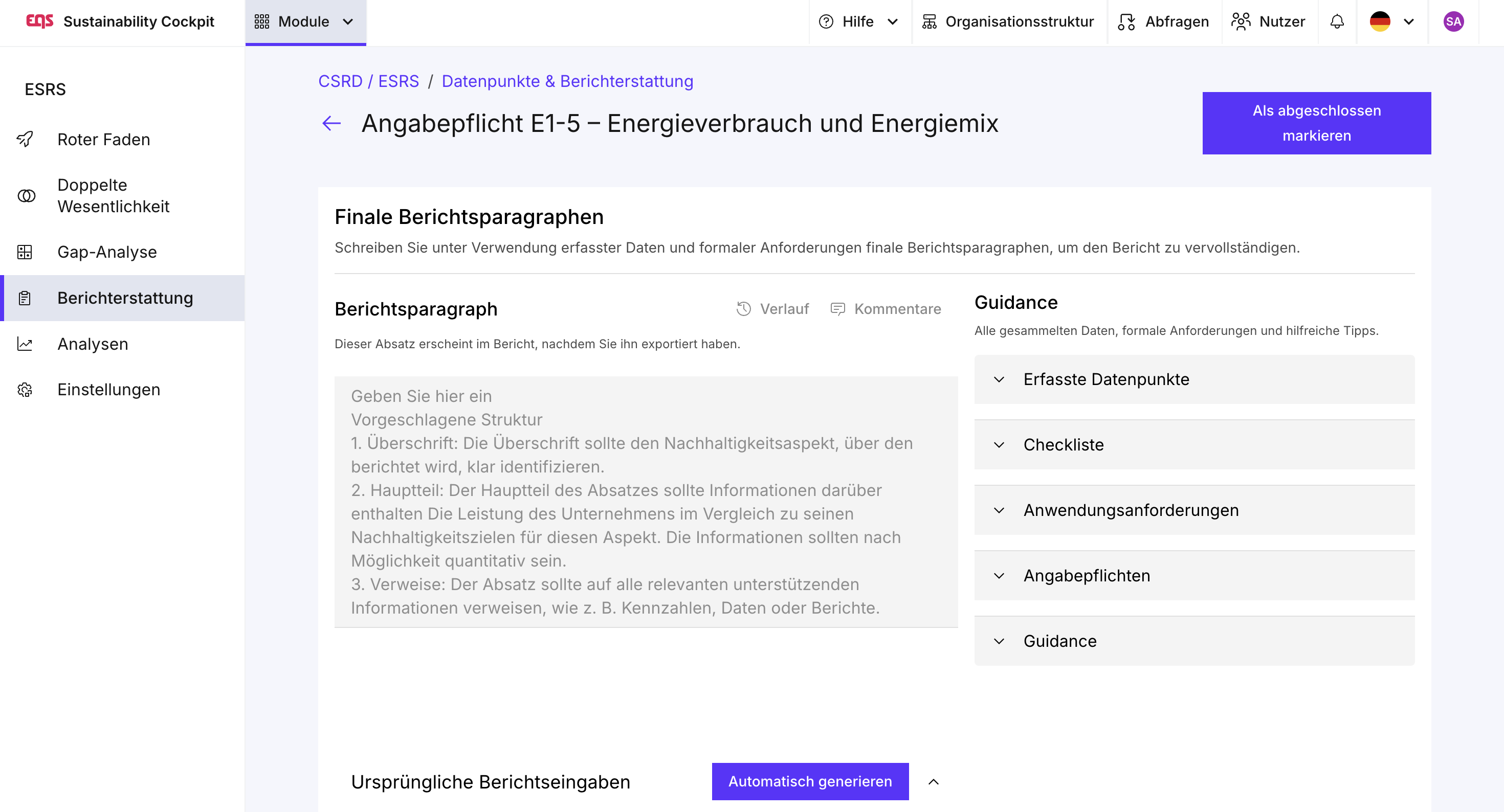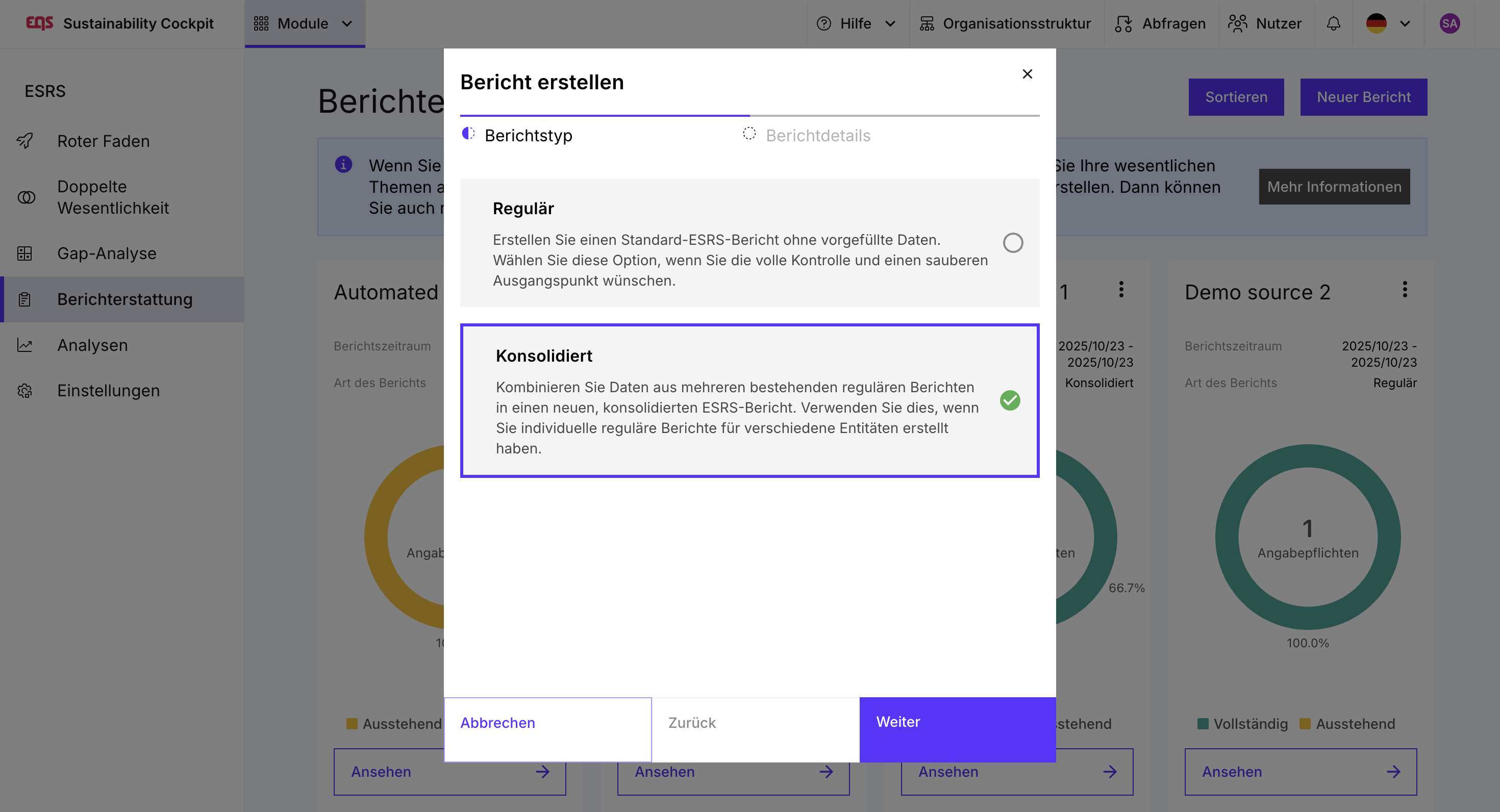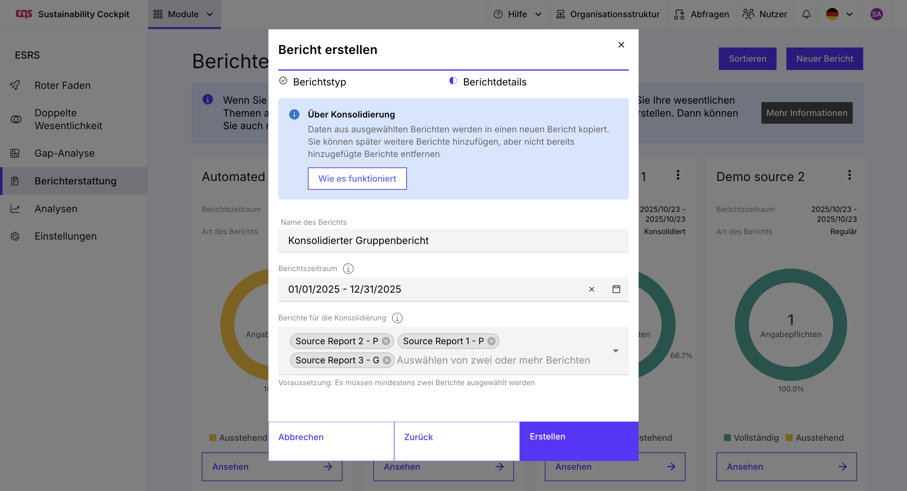 Hinweis: Nur Nutzer mit den Rollen Admin und ESRS Modulmanager können konsolidierte Berichte erstellen und verwalten.Neuen Bericht erstellen