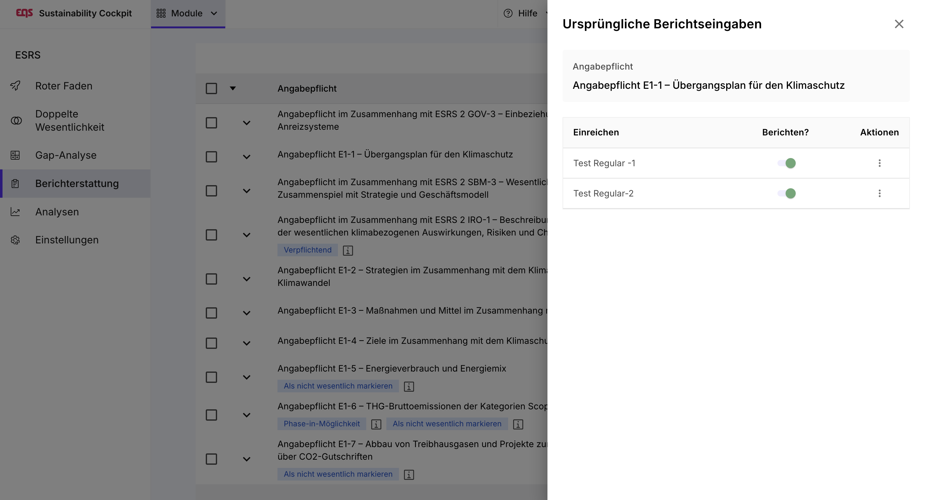 Über das Menü lassen sich die ursprünglichen Berichtseingaben einsehen, sowohl die Begründungen für den Ausschluss einzelner Angabepflichten oder Datenpunkte als auch eine Übersicht, in welchen der Quellberichte diese jeweils ein- oder ausgeschlossen waren.