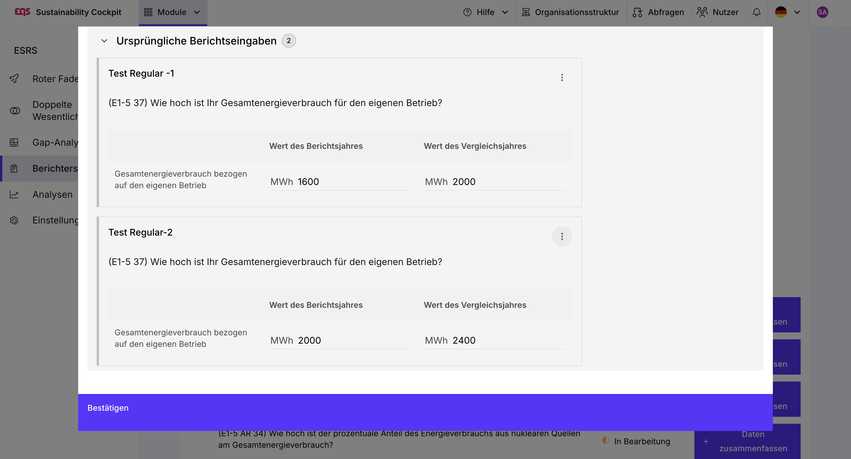 Die Berichtseingaben werden nur angezeigt, wenn der jeweilige Datenpunkt im Quellbericht auch vollständig abgeschlossen wurde. Stelle daher am besten vor der Konsolidierung sicher, dass alle Datenpunkte und Schritte komplett abgeschlossen sind.