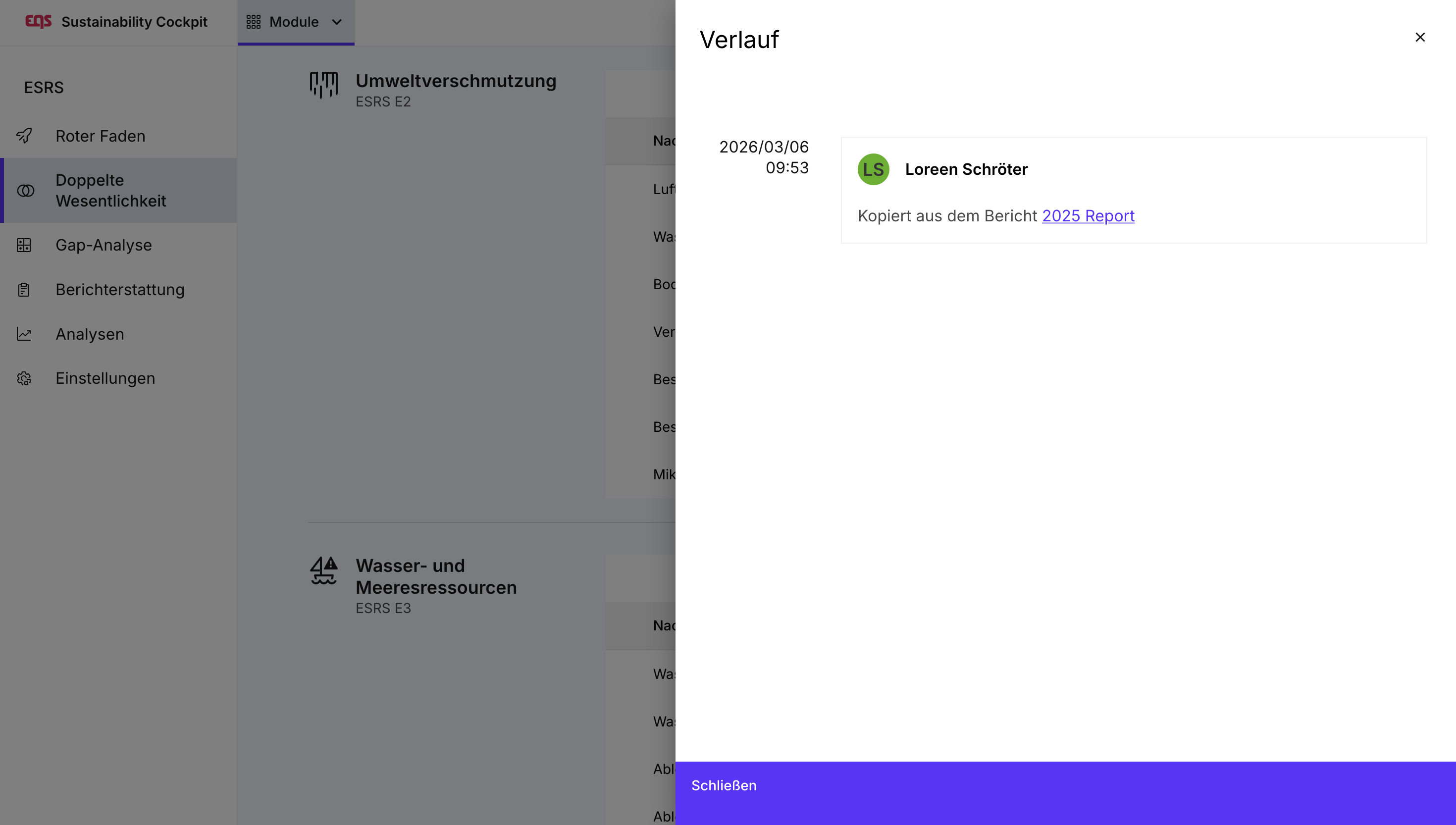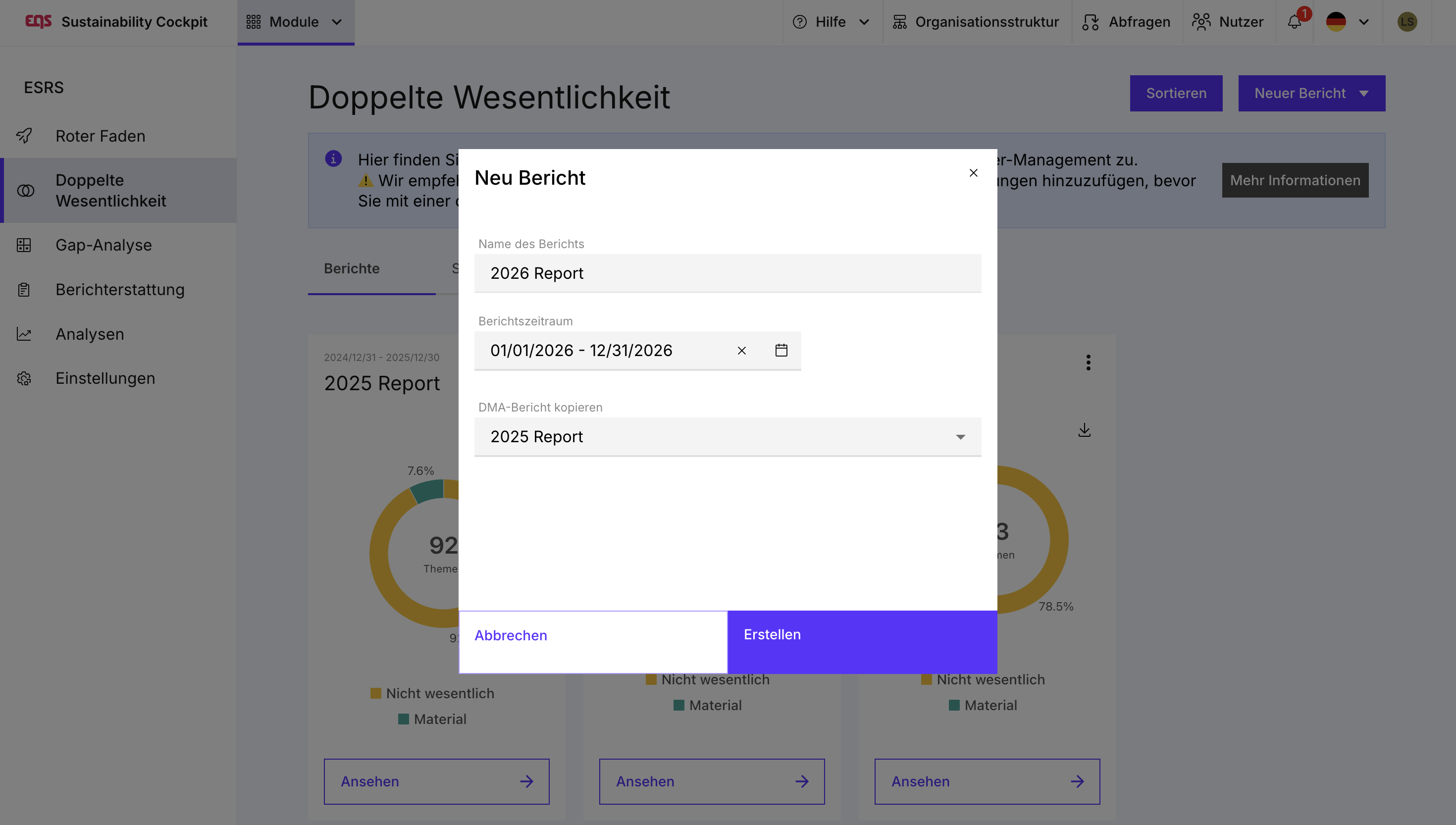 - Öffnen Sie im ESRS-Modul die Übersicht Ihrer Doppelten-Wesentlichkeitsberichte.