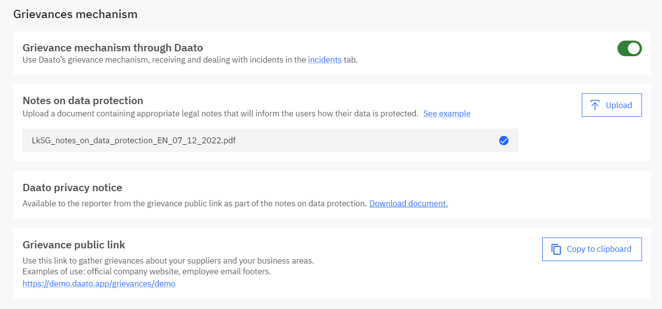 At Daato, you can set up a grievance channel through which stakeholders from your supply chain can submit complaints about human rights or environmental violations. If you are interested, simply activate the switch in the Complaints mechanism section in the “Module settings” menu item.