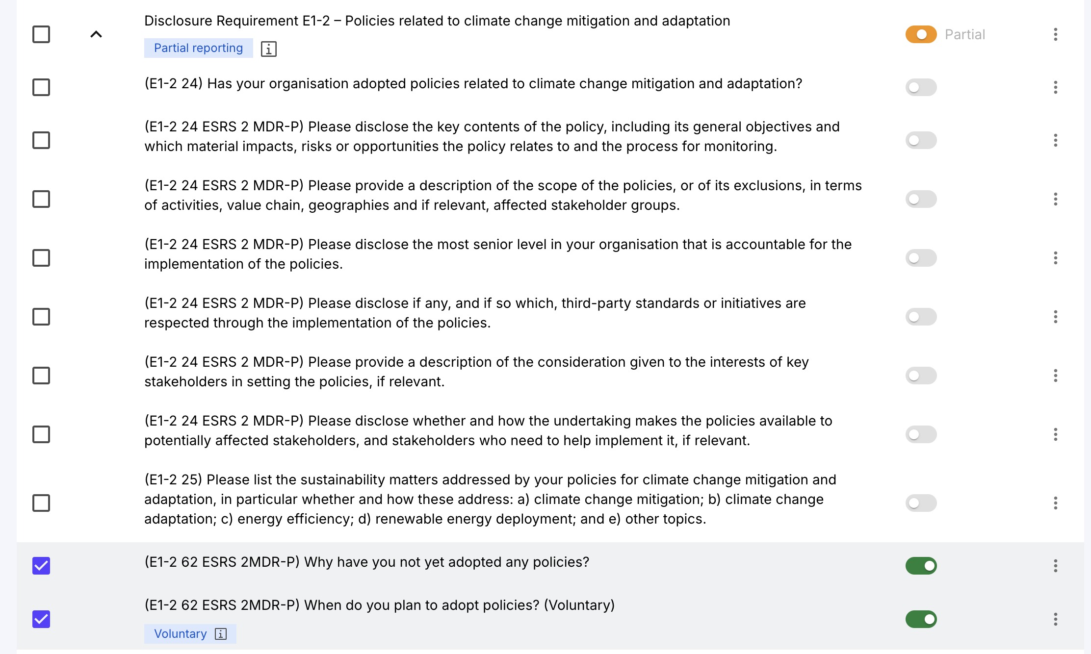 - Disclosure of information required by the disclosure requirement related to metrics (including its individual data points) does not need to reported if the information is not material (ESRS 1 par. 34): Companies can opt to omit information on metrics if these are not material. The "Mark as non-material" label identifies disclosure requirements that can be completely excluded.