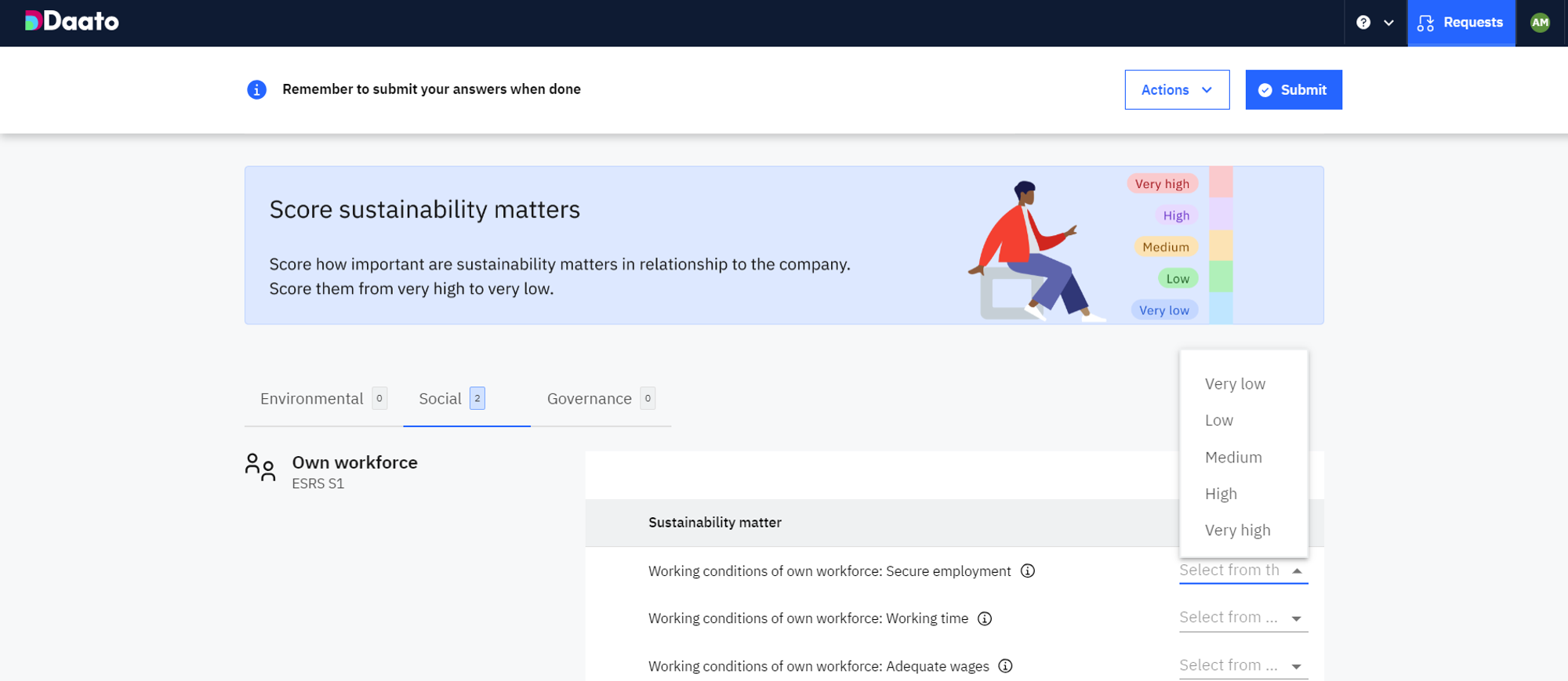 Access the list of these sustainability matters by clicking on their relevant ESG category, “Environment”, “Social” or “Governance”.