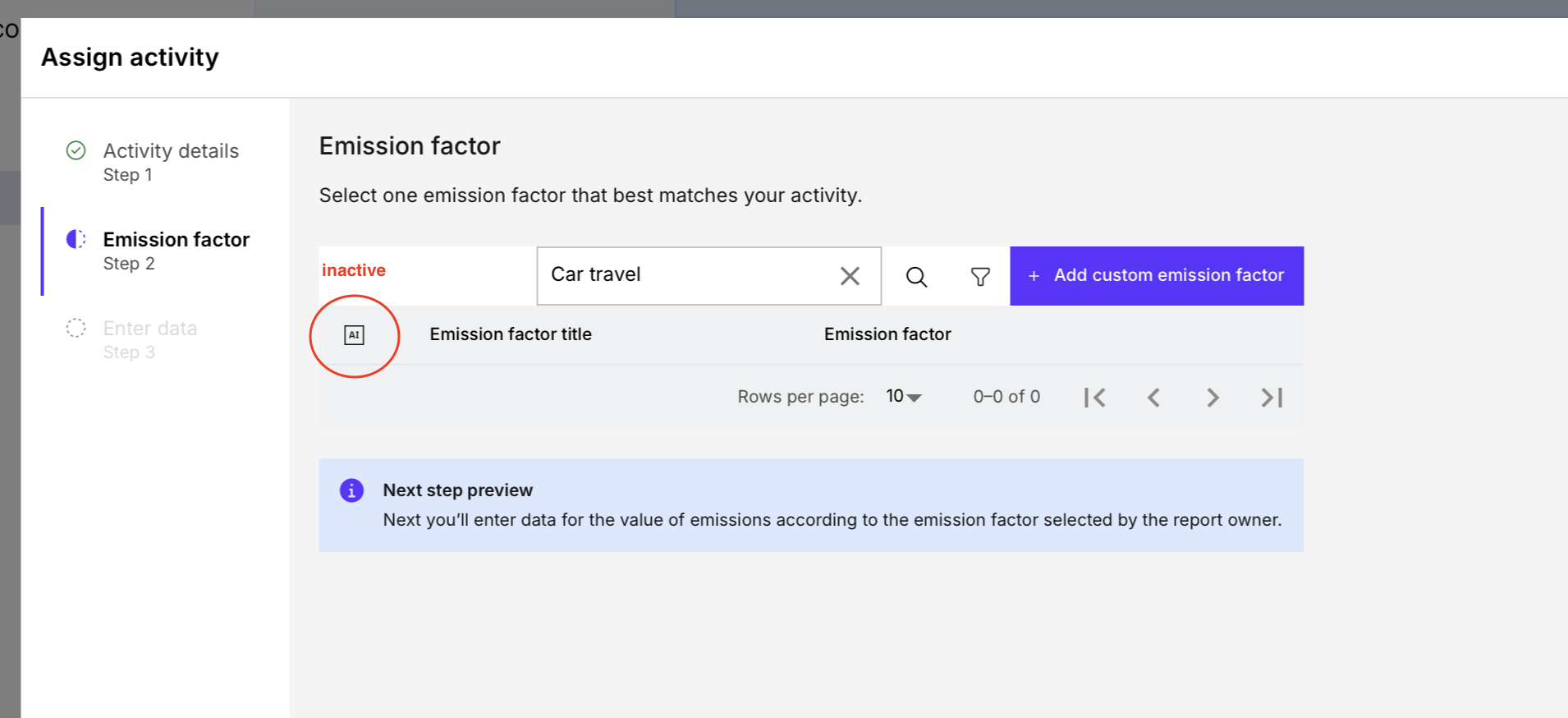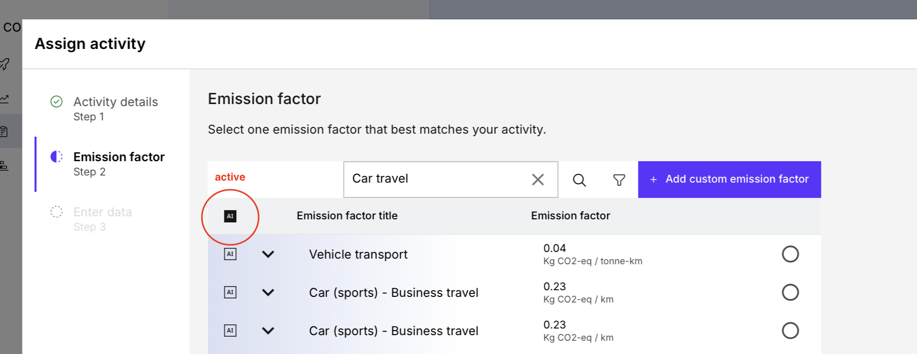 When AI Assist is enabled, additional alternative or related emission factors may be suggested.