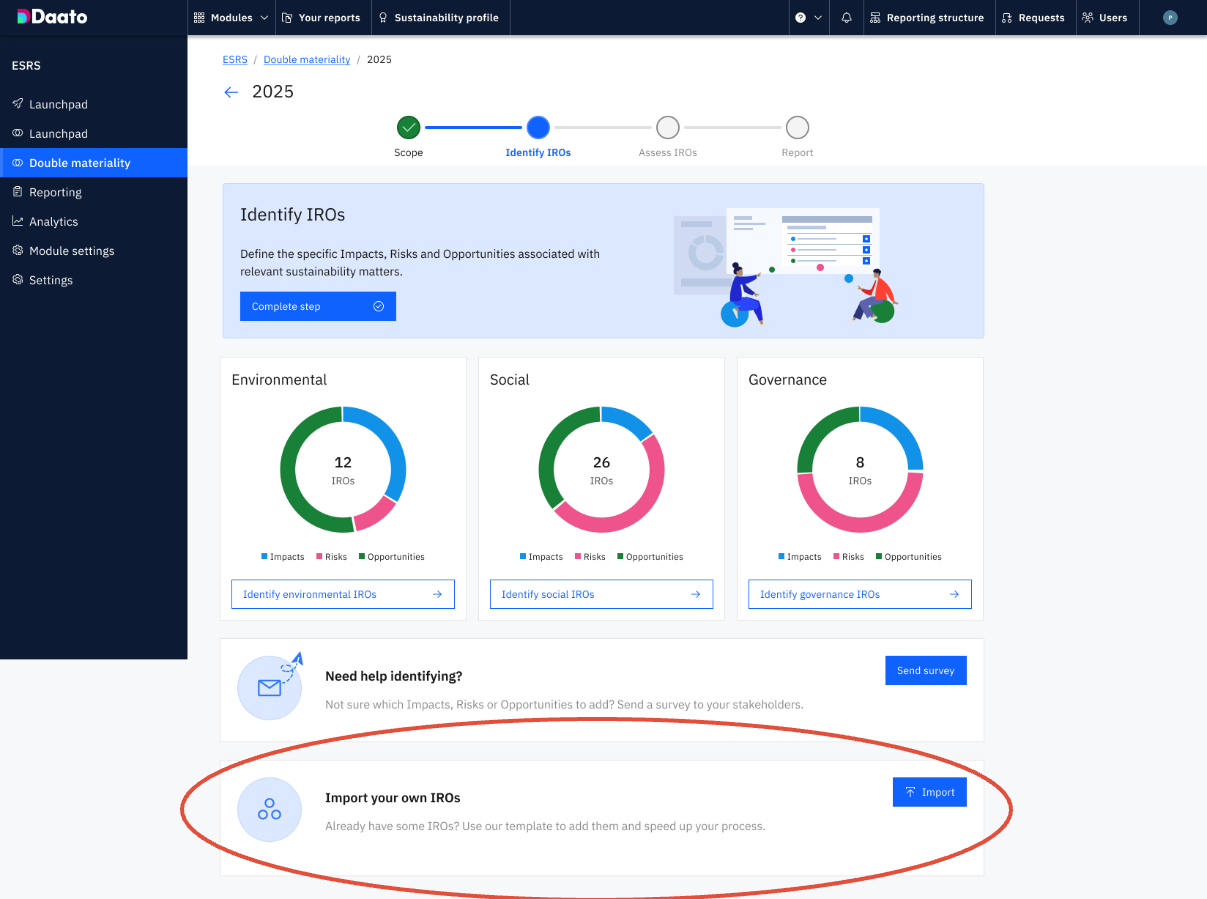 In Step 2 of the materiality assessment, “Identify IROs,” scroll to the bottom of the page and click on “Import.”
