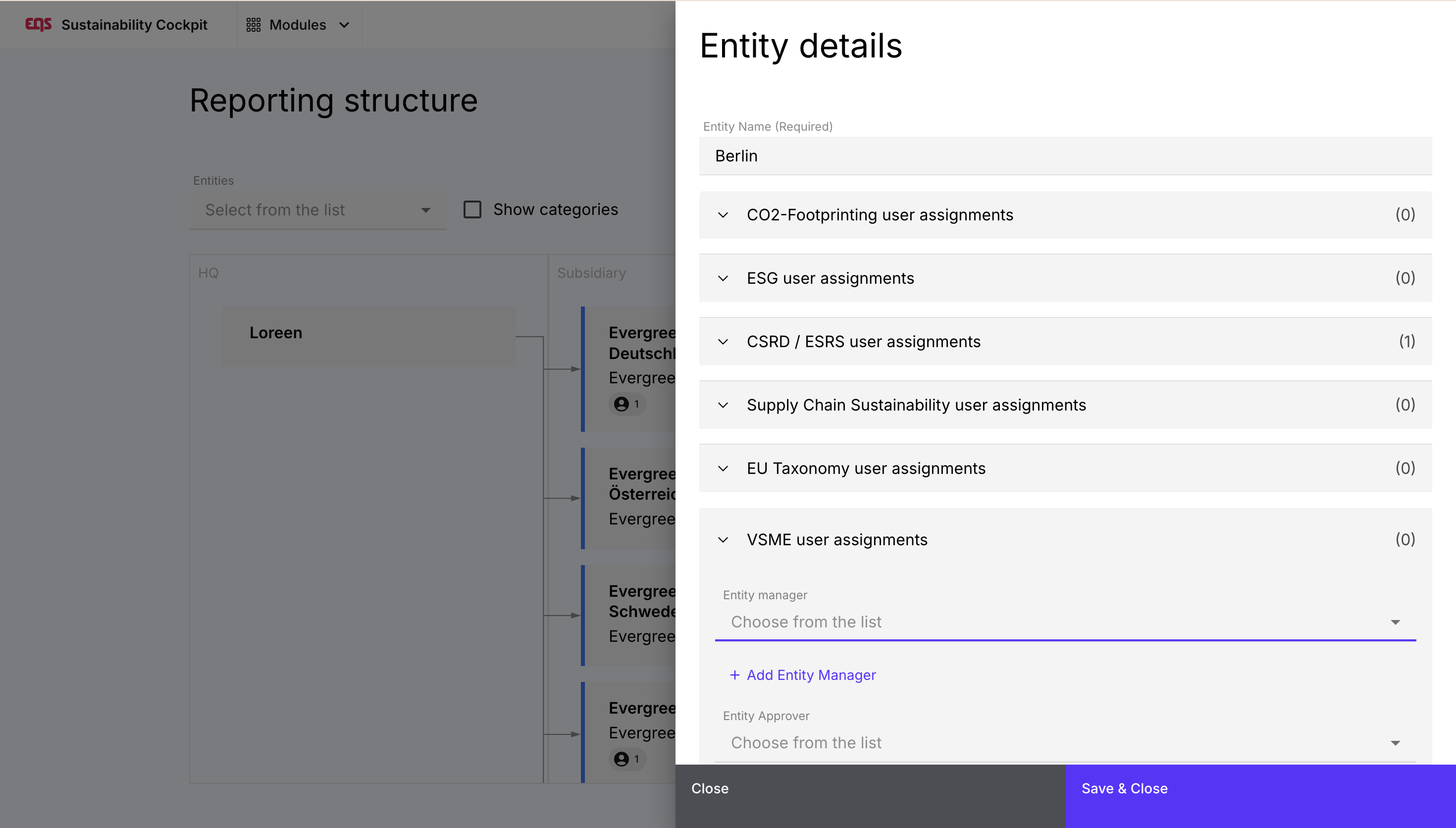 Make sure to assign your entity manager to their correct entity in the organizational structure before you start. They will only get the right permissions for their entity after this step.Entity Manager can only see the reports, their entity is assigned to.VSME Entity Approver: