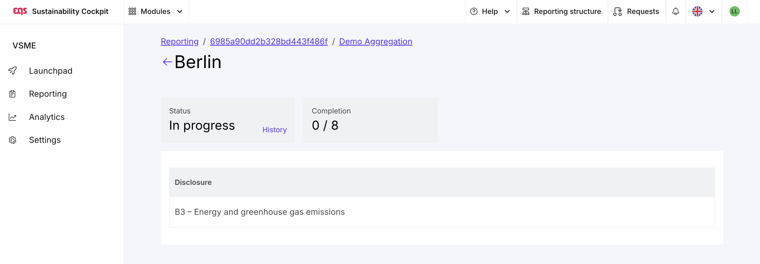 | • Access to the Launchpad • Access to Analytics •List reports that do not contain an entity to which the user is assigned as the Entity Manager • Manage reports • Access to Step 1 and Step 3 of the reports • Access data points that are part of a manual data collection in Step 2 • View entities in the aggregation to which the user is not assigned, unless they are predecessors or successors of those entities • Mark the aggregation as complete in Step 2 • Modify or submit entity data in the aggregation unless the Entity Manager position for VSME is assigned for that entity • Reopen data collection for an entity in the aggregation unless the Entity Manager position for VSME is assigned for that entity or its parent entity • Approve data for an entity in the aggregation • Consolidate reports • Access to Settings and Sustainability Profile |