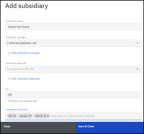 Si la persona que quieres asignar como responsable o aprobador ya está registrada en tu instancia de Daato, su dirección de correo aparecerá en el desplegable. De lo contrario, puedes crear un nuevo usuario directamente desde este formulario.