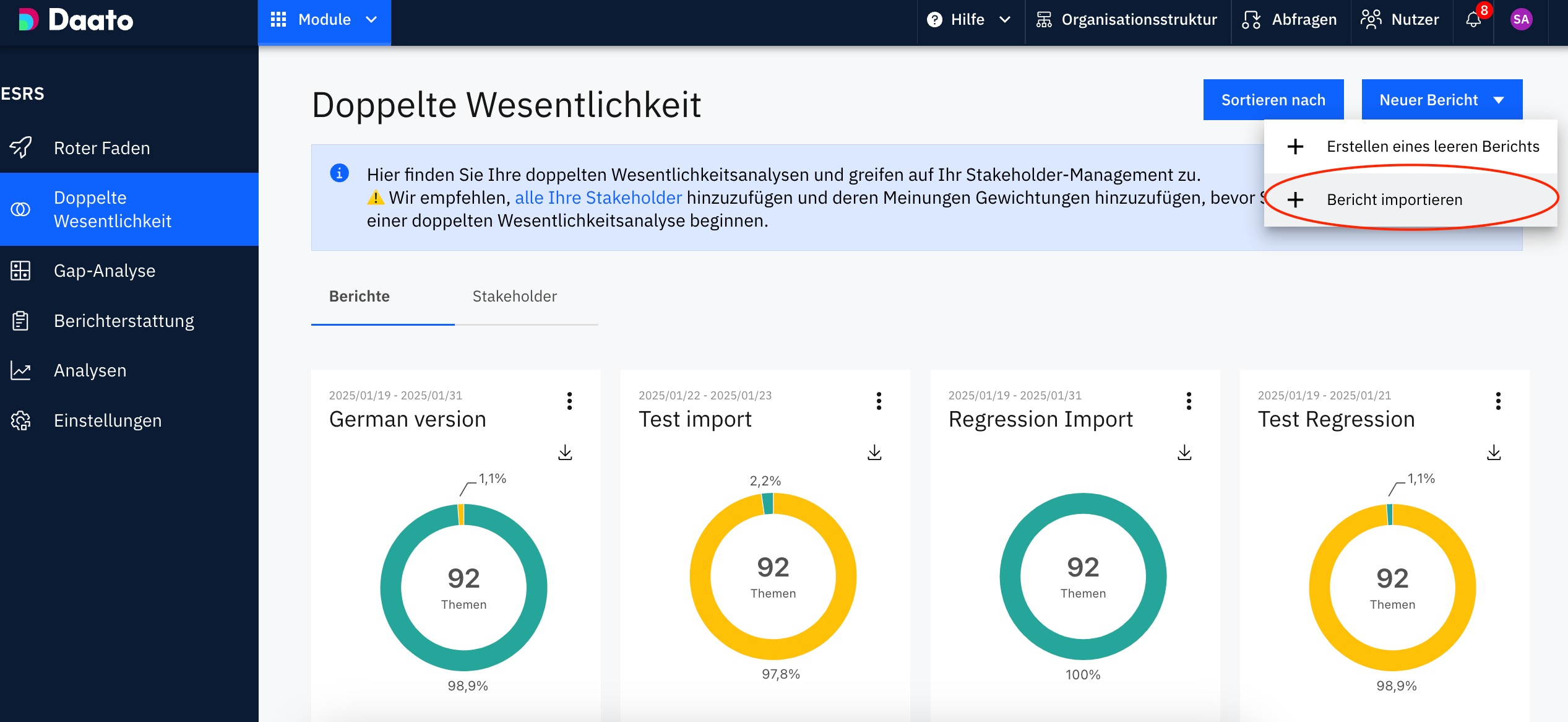 Desde la vista de evaluación de materialidad, haz clic en Nuevo informe y selecciona la opción Importar informe.