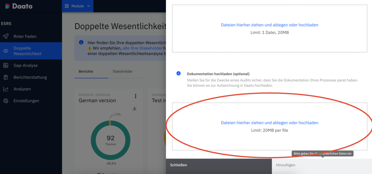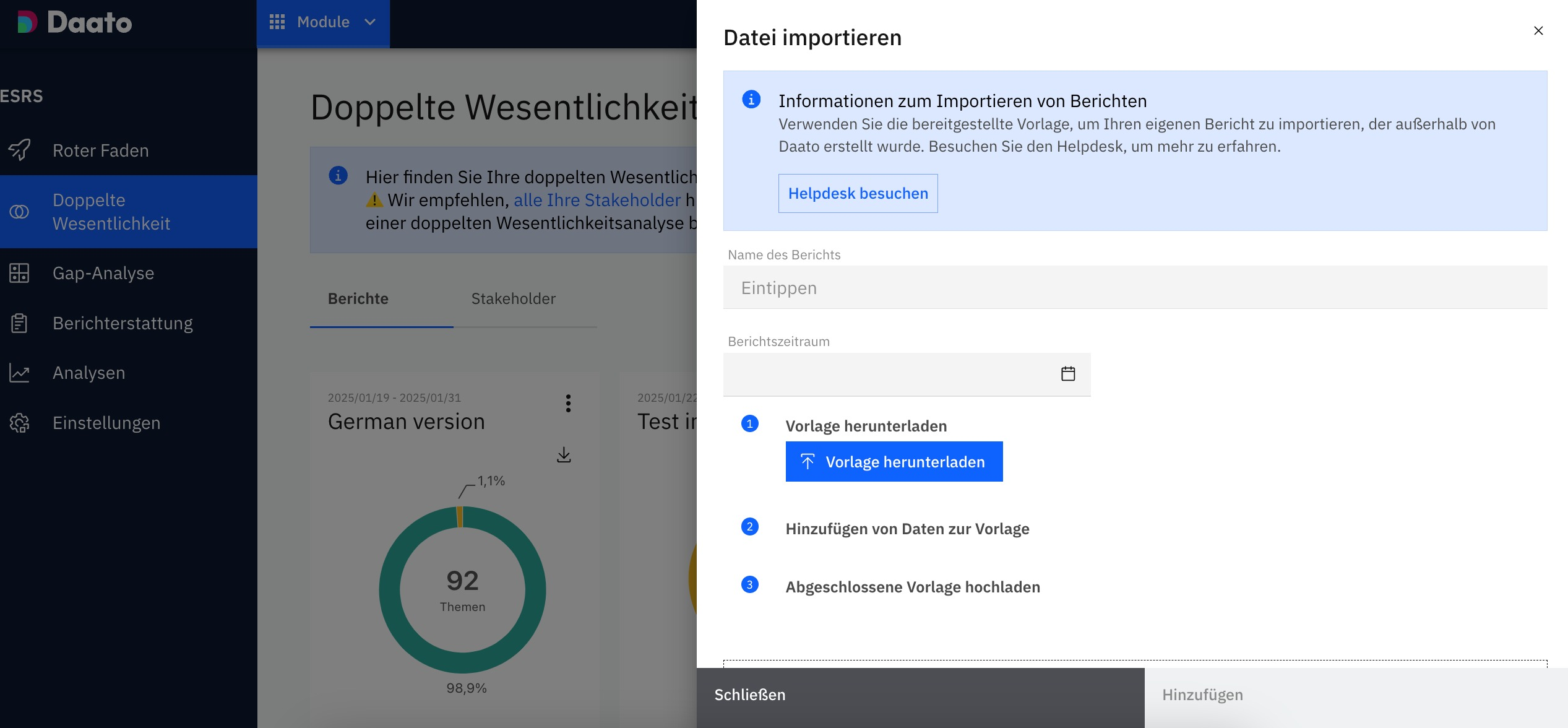Si realizaste una evaluación de materialidad fuera de Daato, puedes importar tanto los resultados como la documentación asociada de la siguiente manera: