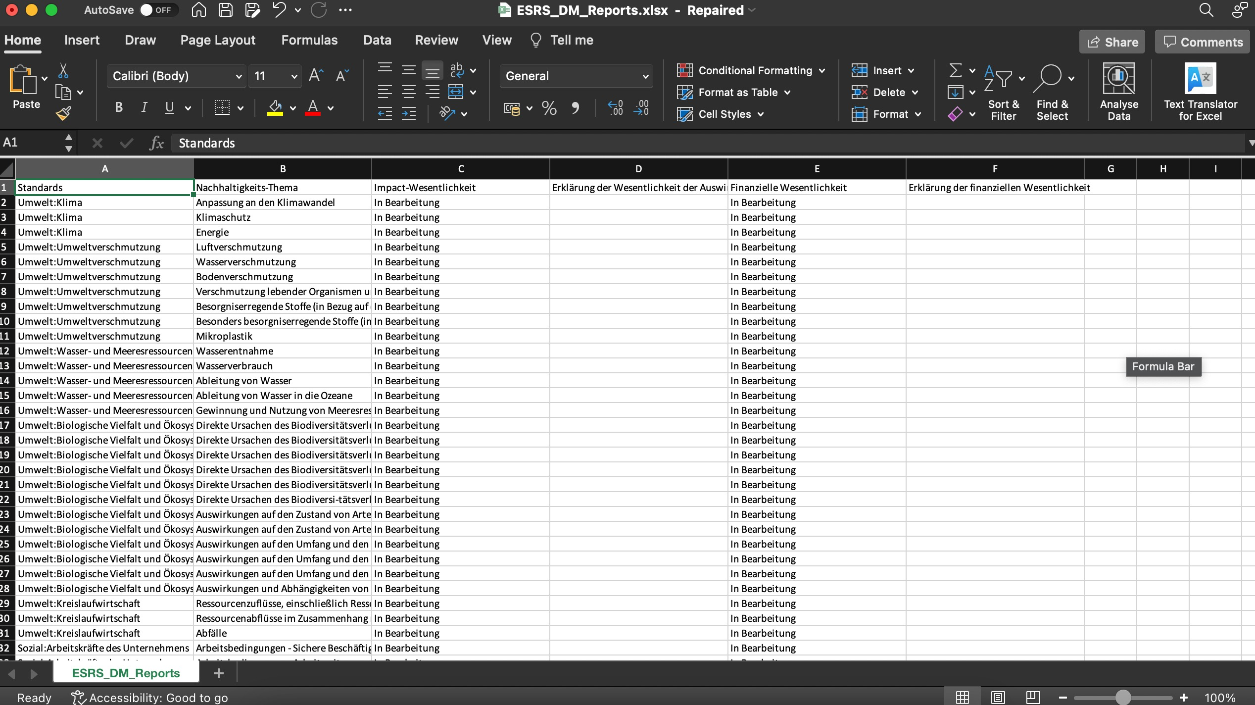 La plantilla ya está prellenada con todos los temas de sostenibilidad estándar (solo se completan las dos primeras columnas).