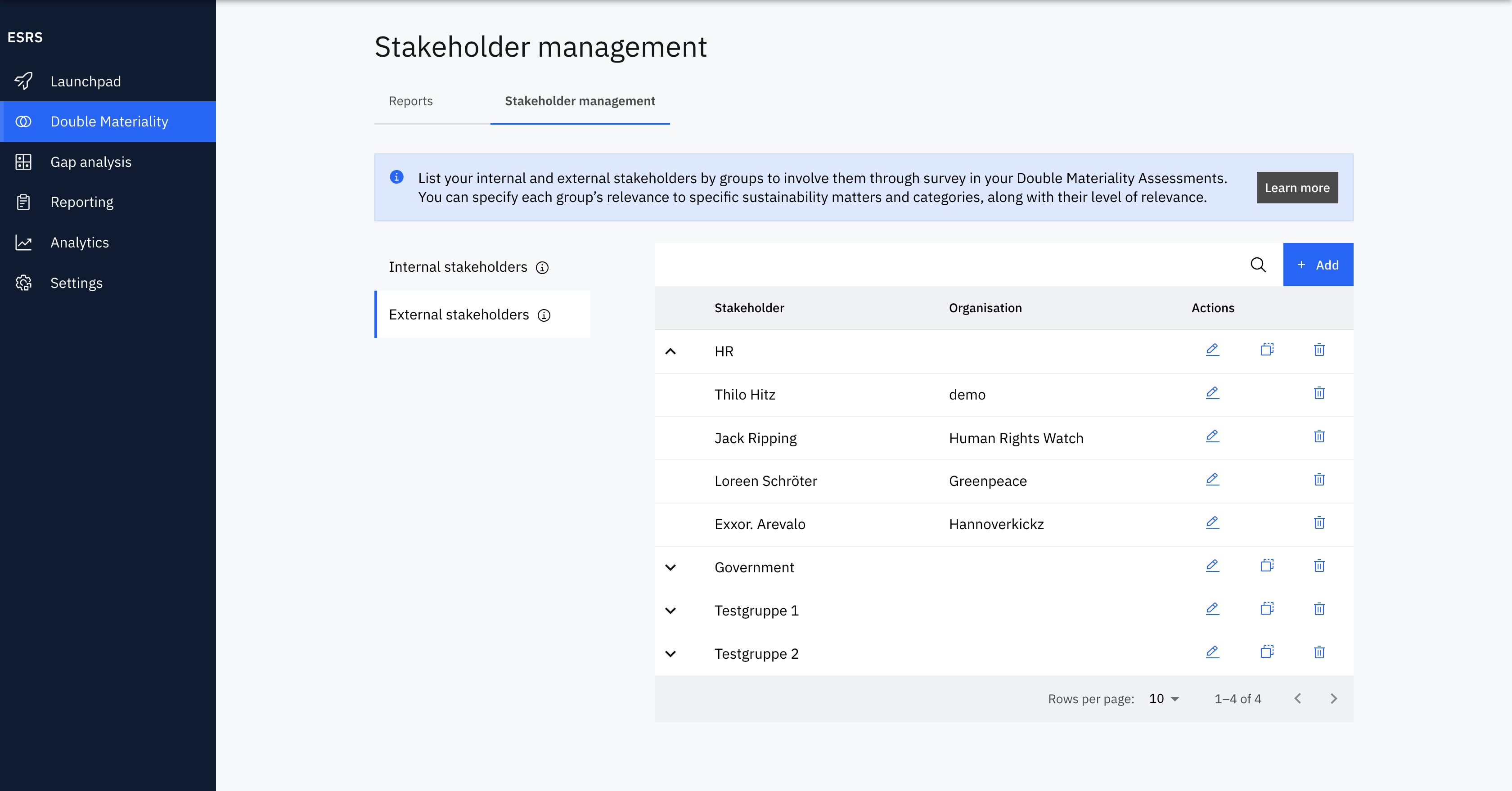Daato ofrece la posibilidad de registrar en la herramienta tanto grupos de partes interesadas internas y externas como partes interesadas individuales, y asignarles temas específicos de sostenibilidad junto con una ponderación correspondiente.