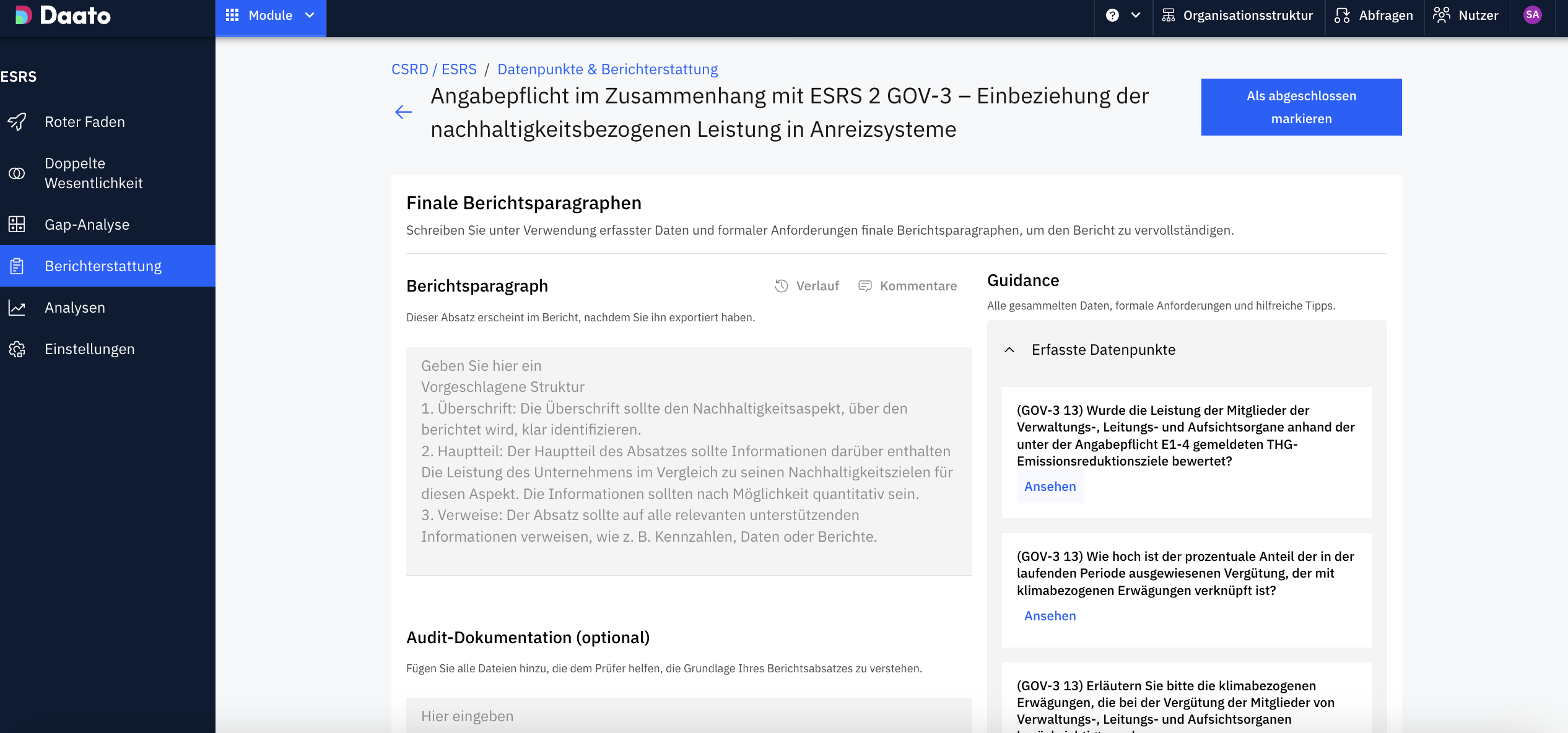 Al hacer clic en “Redactar párrafo del informe” accederás al requisito correspondiente y podrás escribir el párrafo final, citando los puntos de datos registrados en el área de ayuda derecha.