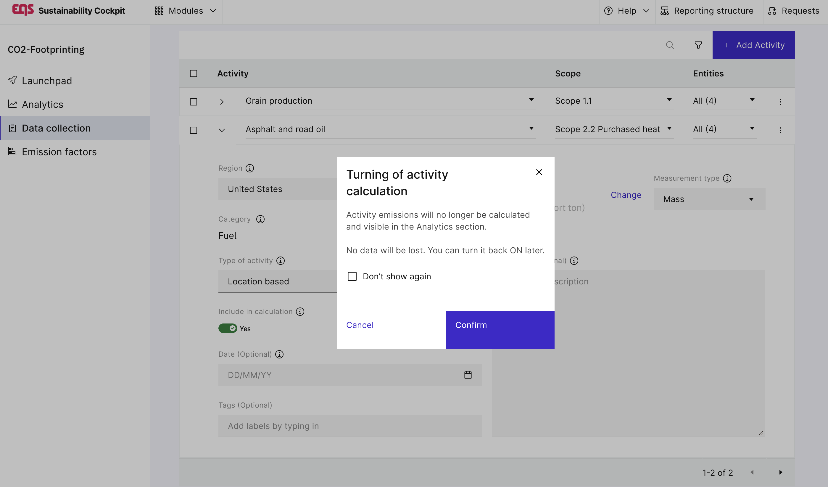 Elegir qué valor incluir en la Huella de Carbono Corporativa (CCF). Por defecto, todas las actividades están incluidas; puedes excluir algunas con el selector.