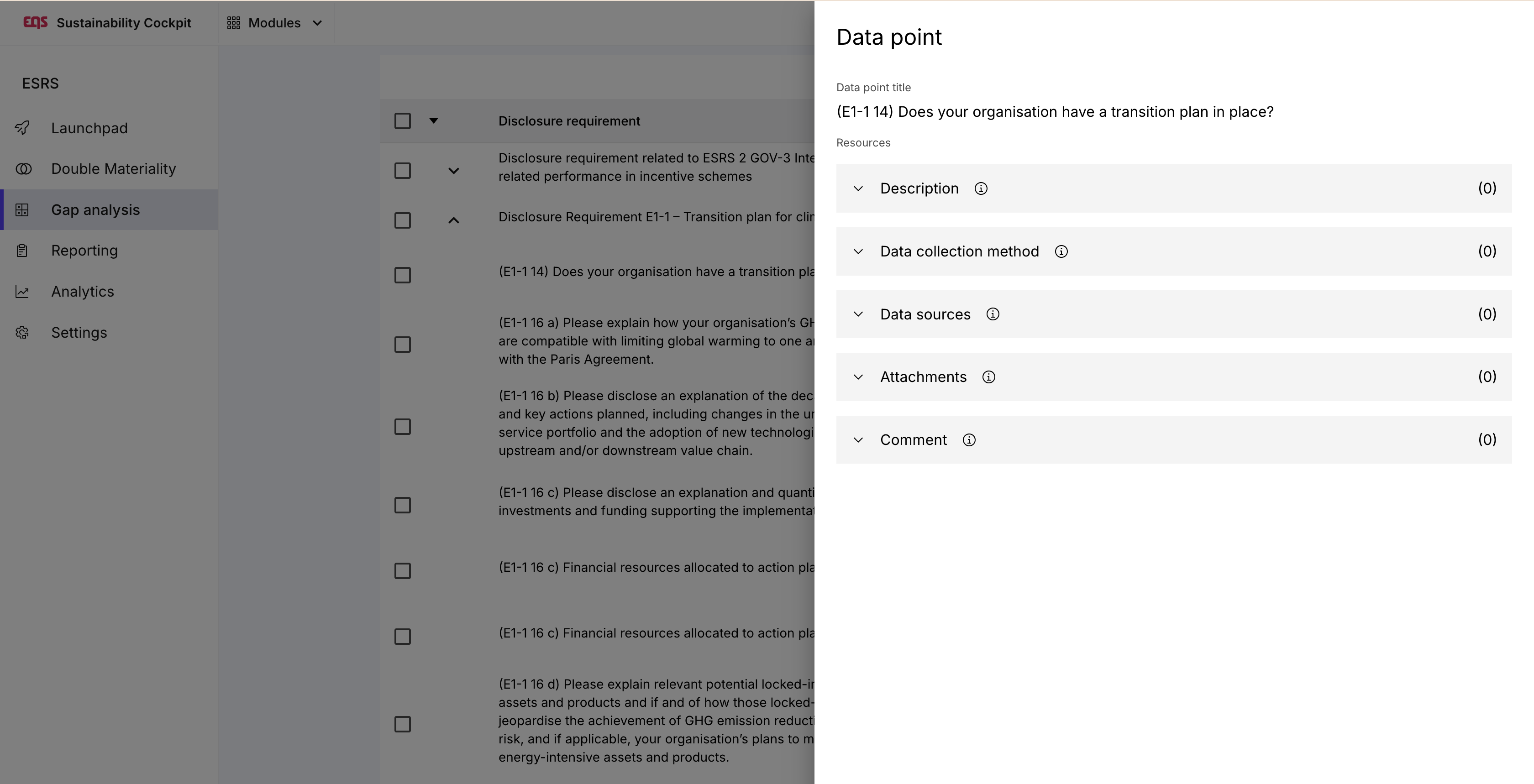De este modo preparas de manera focalizada el proceso de reporte y evalúas estructuradamente el nivel de cumplimiento. El análisis de brechas también puede integrarse directamente en el reporte ESRS, permitiendo reutilizar de inmediato todas las evaluaciones preparatorias.