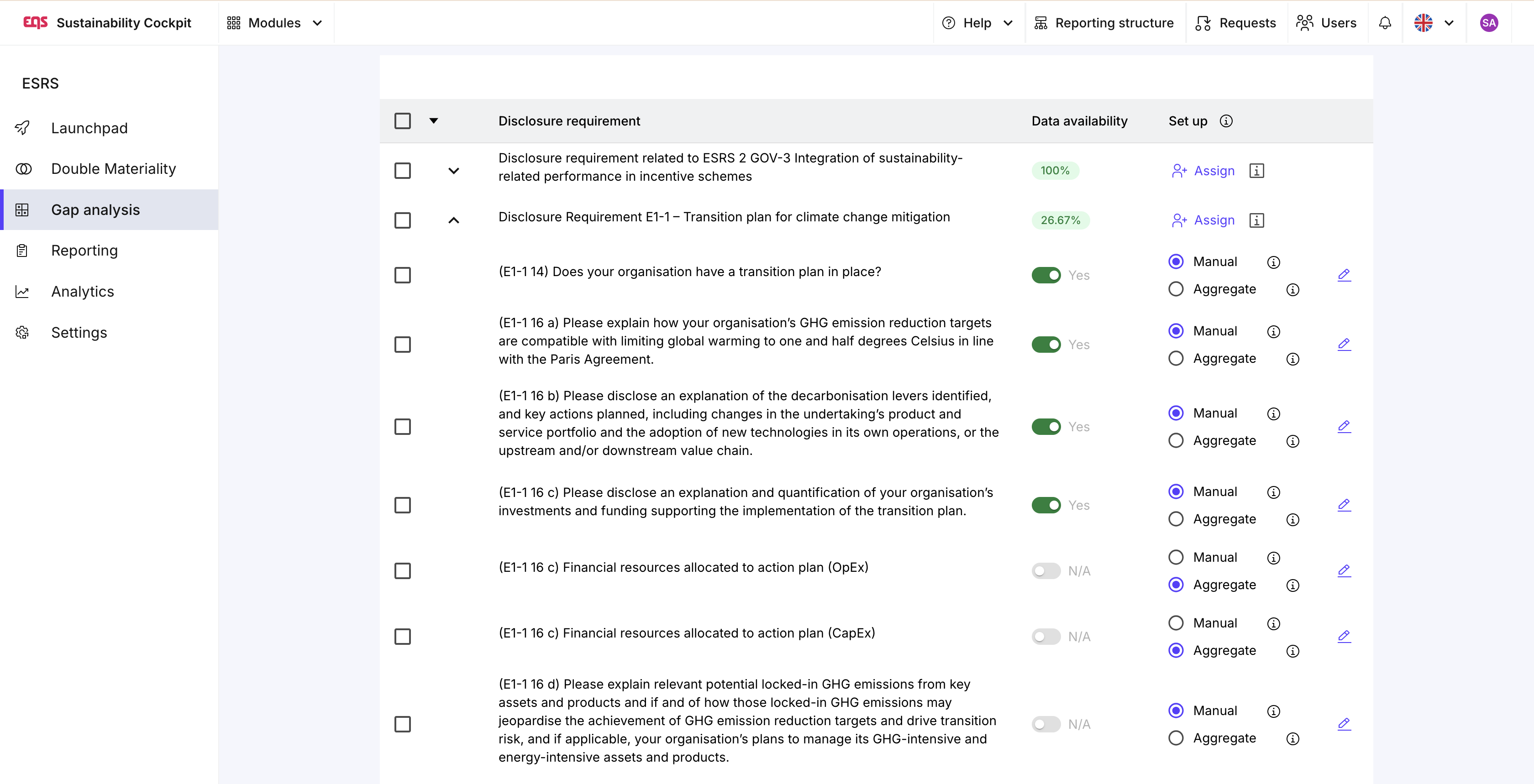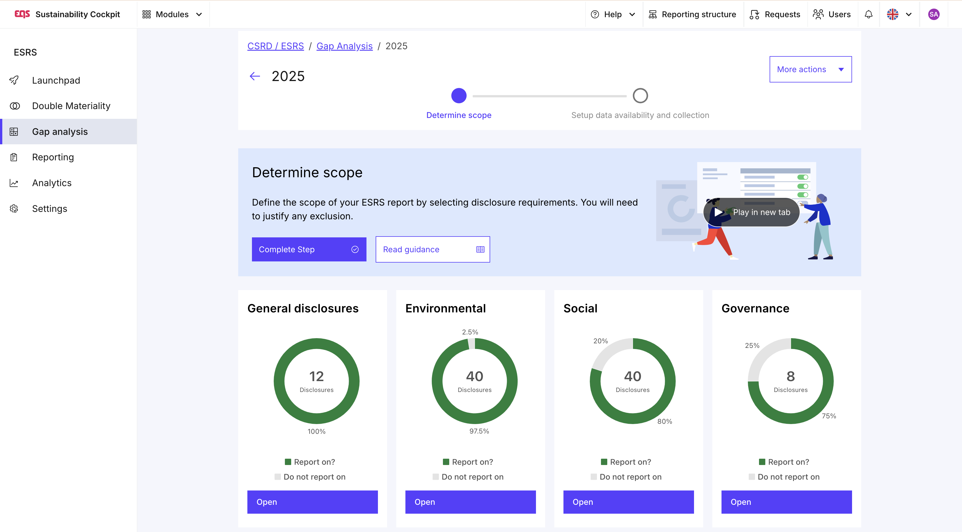 Al abrir el análisis de brechas, llegarás directamente al primer paso, “Definir alcance”. Aquí determinas qué requisitos de divulgación y puntos de datos incluir en tu reporte. Si previamente integraste tu Double Materiality Analysis, esta fase se precompleta automáticamente: los requisitos y puntos de datos materiales aparecen activos, y los no materiales quedan desactivados.