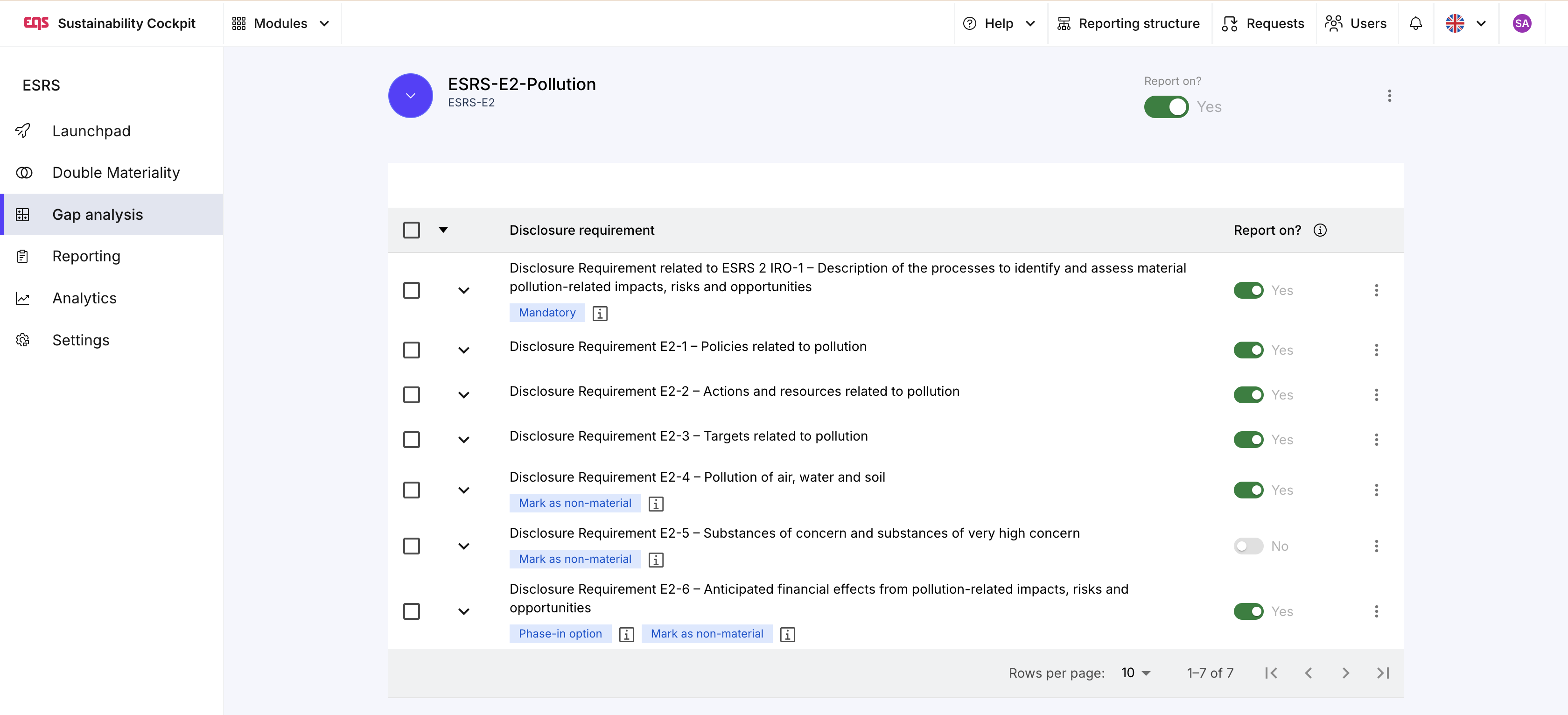 En la columna “¿Incluir en reporte?”, el color verde indica los elementos incluidos y el gris los excluidos. Aunque el perímetro se haya establecido automáticamente, es recomendable revisar y ajustar individualmente cada requisito o punto de datos usando los interruptores. Si no has integrado la Double Materiality Analysis, todas las entradas se activan por defecto: en ese caso seleccionas manualmente lo que deba entrar en el reporte, puedes aplicar disposiciones de fase-in y excluir puntos de datos voluntarios específicos. Para más detalles sobre la selección de requisitos, consulta este artículo.