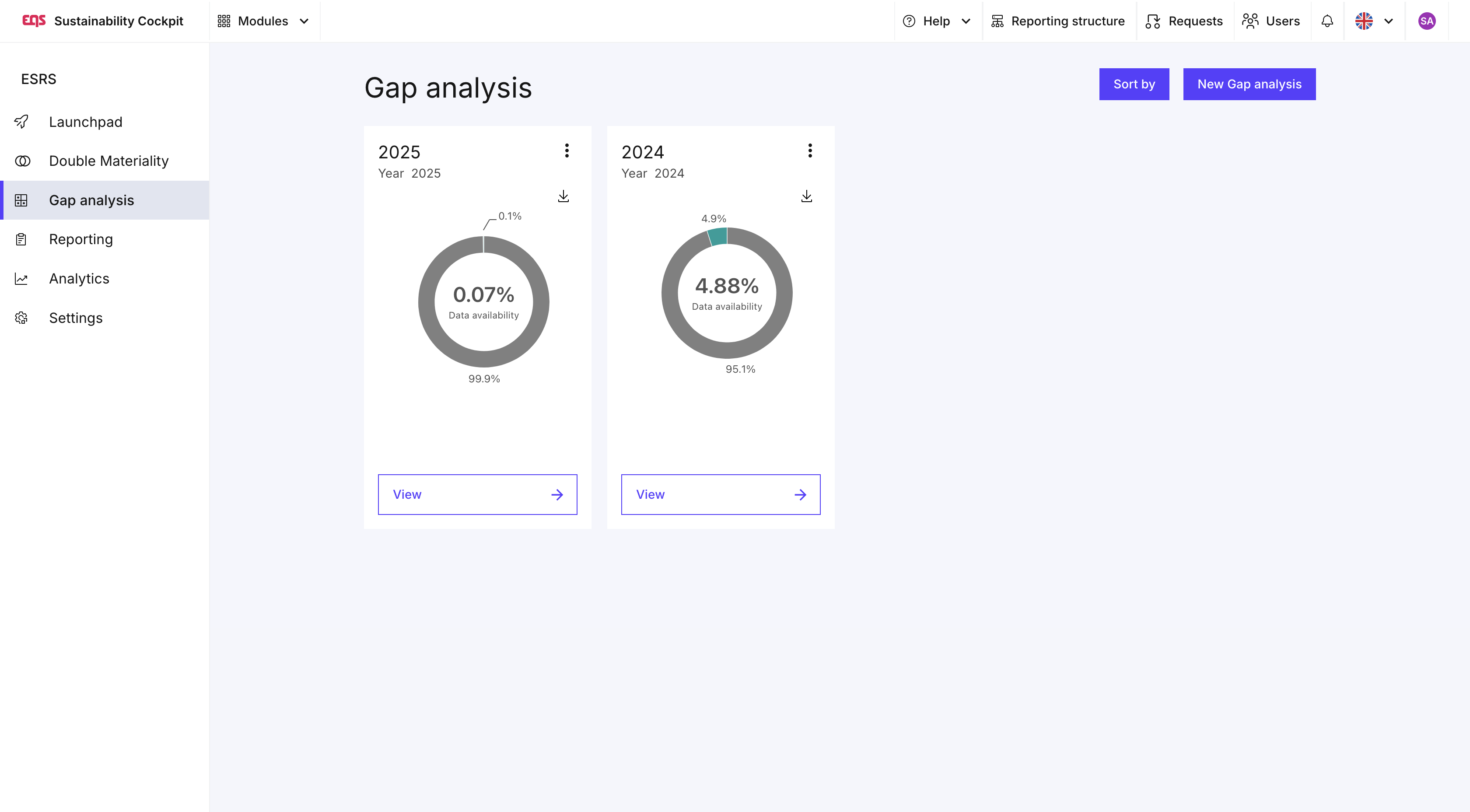 Al iniciar un nuevo análisis de brechas, puedes seleccionar tu Double Materiality Analysis ya realizada en el Sustainability Cockpit. Así, solo se tendrán en cuenta los estándares, requisitos y puntos de datos que hayas clasificado como materiales.