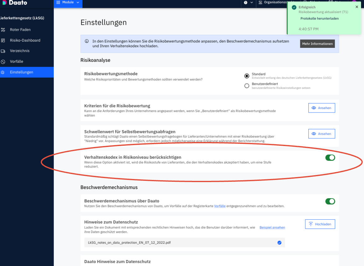 Usando el interruptor situado en el recuadro señalado en la captura de pantalla a continuación, también puedes emplear el Código de Conducta para influir en la evaluación de riesgo del proveedor. Si activas el interruptor y el proveedor acepta y firma el Código de Conducta, su nivel de riesgo se reducirá en un grado.