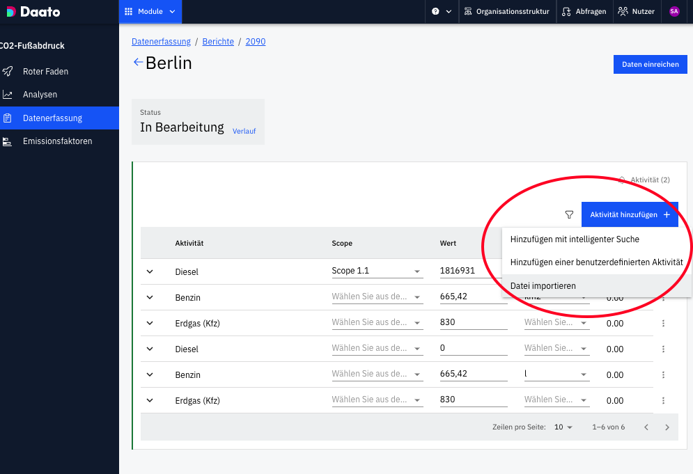 Para calcular las emisiones de CO₂ de tu empresa, tú o los responsables de cada entidad debéis introducir o subir las actividades en nuestra plataforma. Daato multiplica estas actividades por los factores de emisión correspondientes y calcula automáticamente las emisiones asociadas.