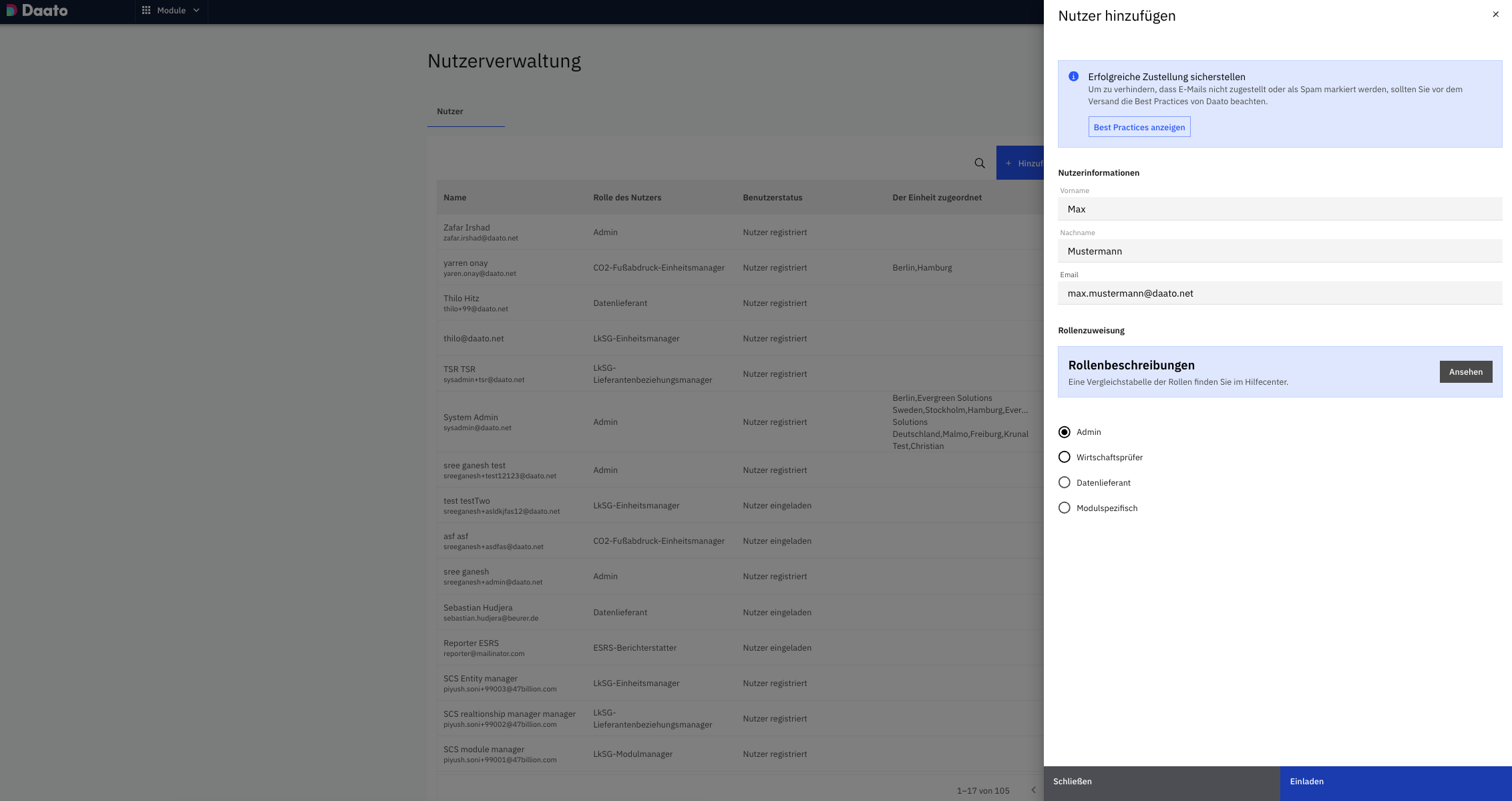 Los usuarios no pueden registrarse en el sistema de forma independiente. Solo pueden ser invitados a través de la pestaña de gestión de usuarios, y luego recibirán una invitación por correo electrónico con un enlace para configurar su contraseña e iniciar sesión en el sistema.