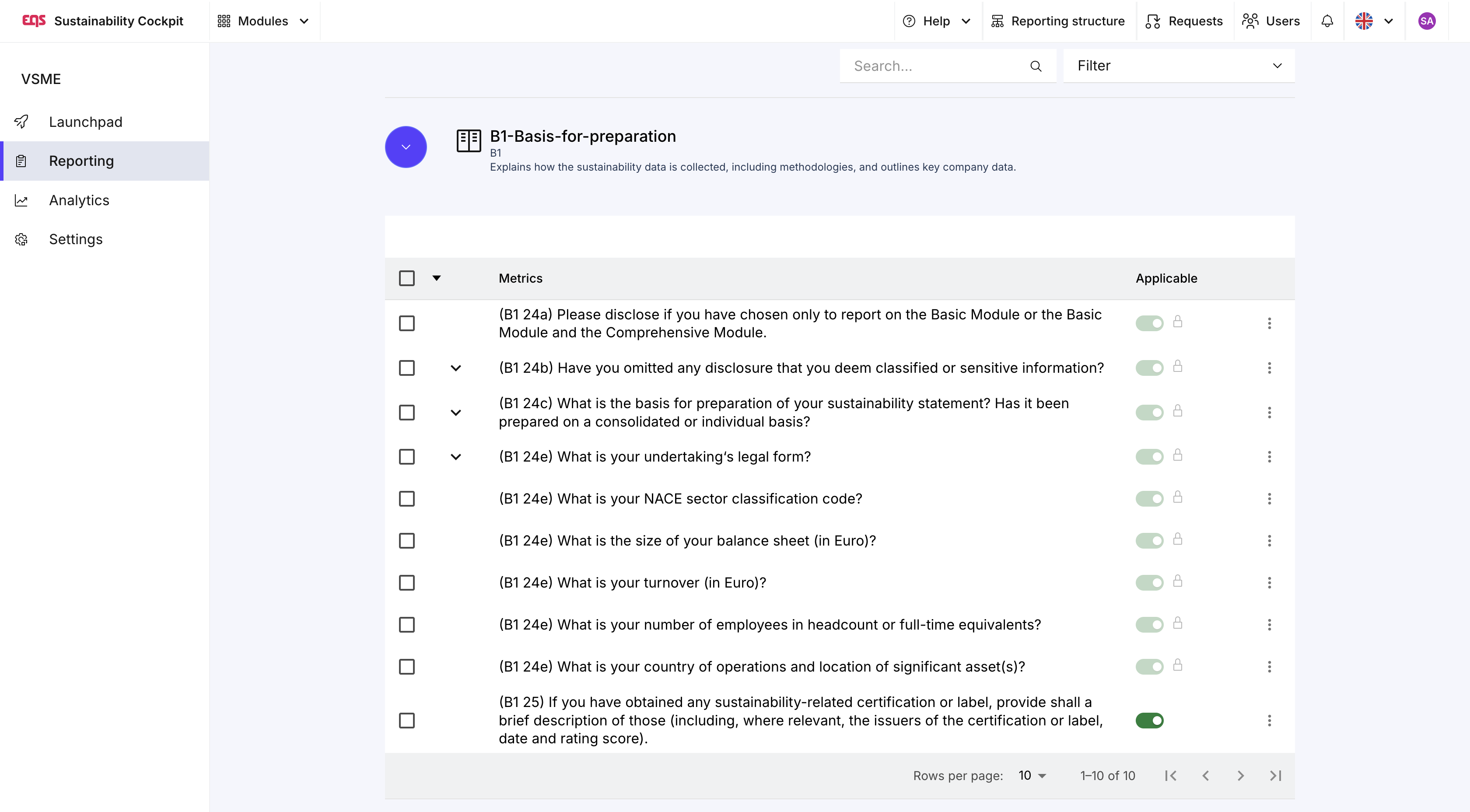 EQS Sustainability Cockpit respalda este principio permitiéndole activar o desactivar cada métrica según su aplicabilidad. Si una métrica se desactiva, debe proporcionarse una justificación clara.