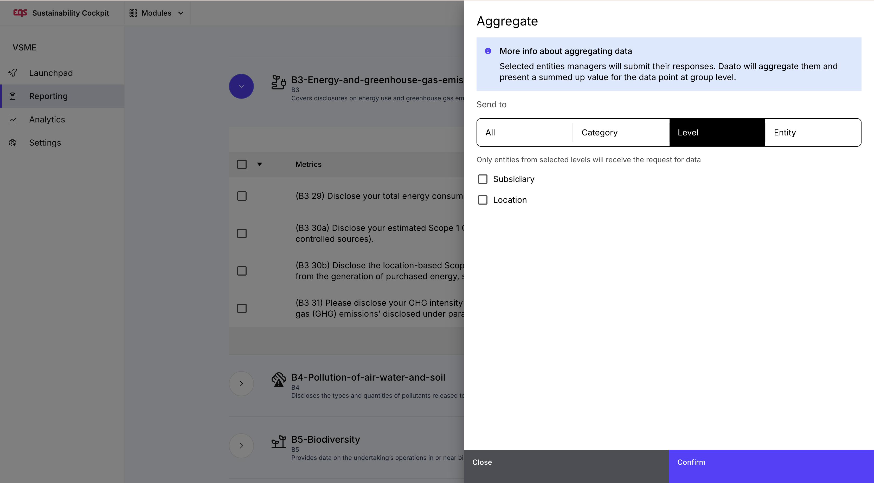 Una vez confirmado el alcance de su informe, está listo para preparar la recopilación de datos. En este paso verá todos los requisitos (p. ej. B1, B2, C1) y puntos de datos seleccionados en el paso 1.