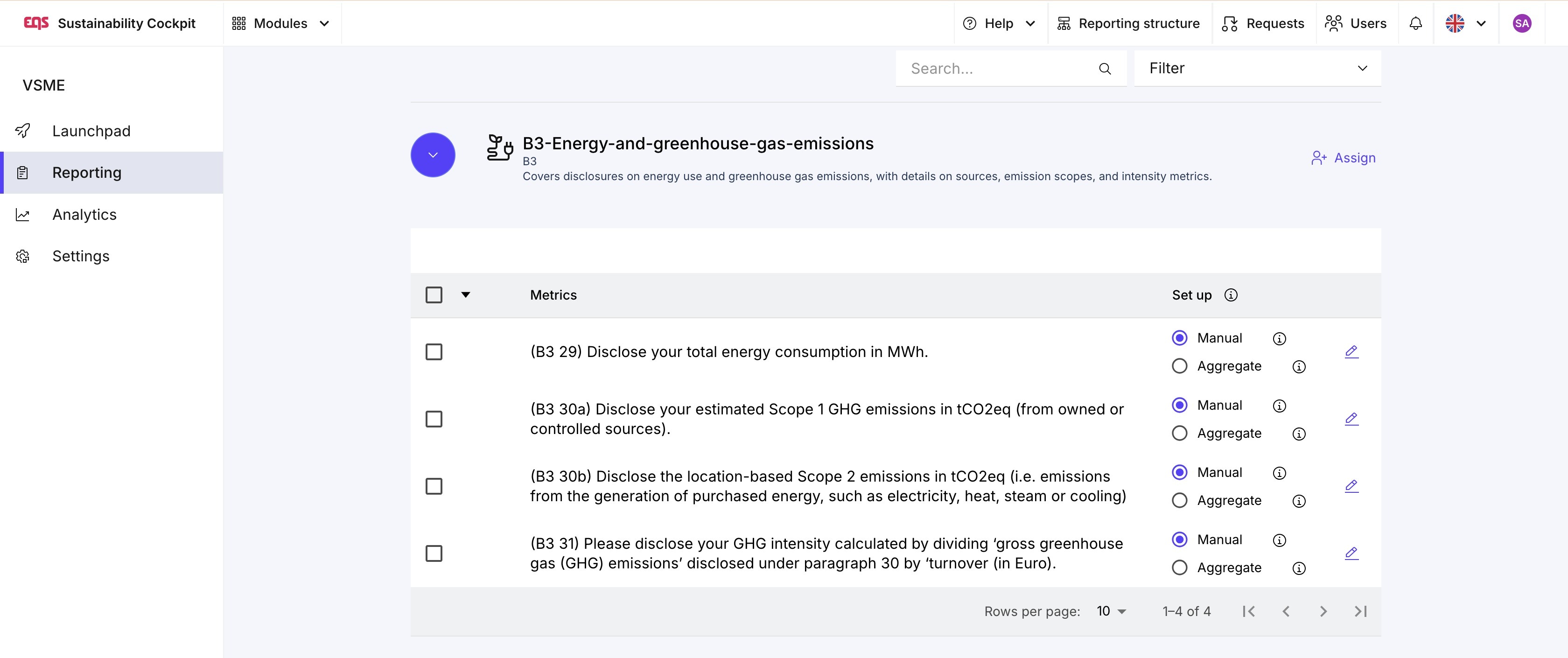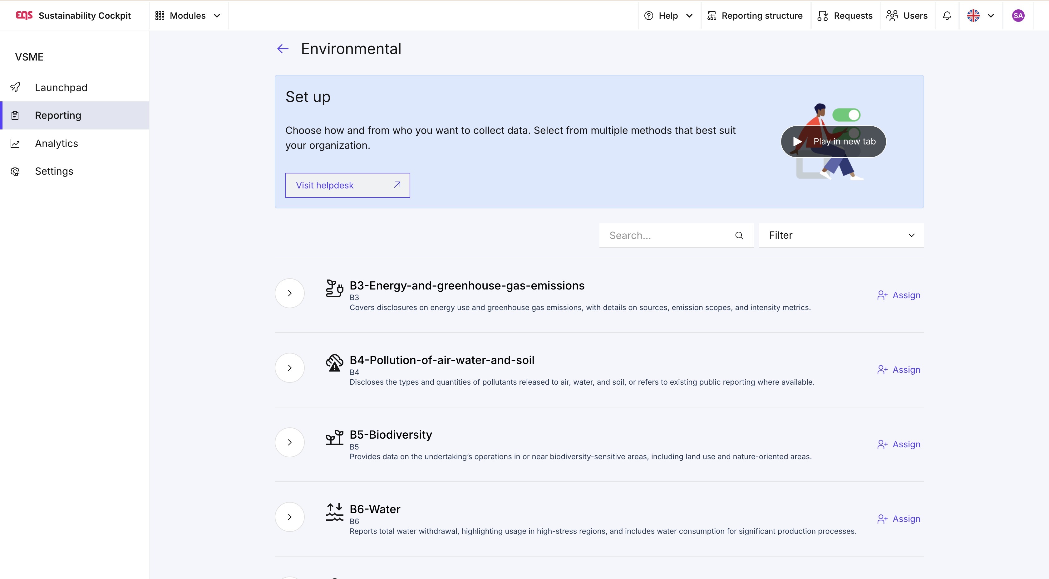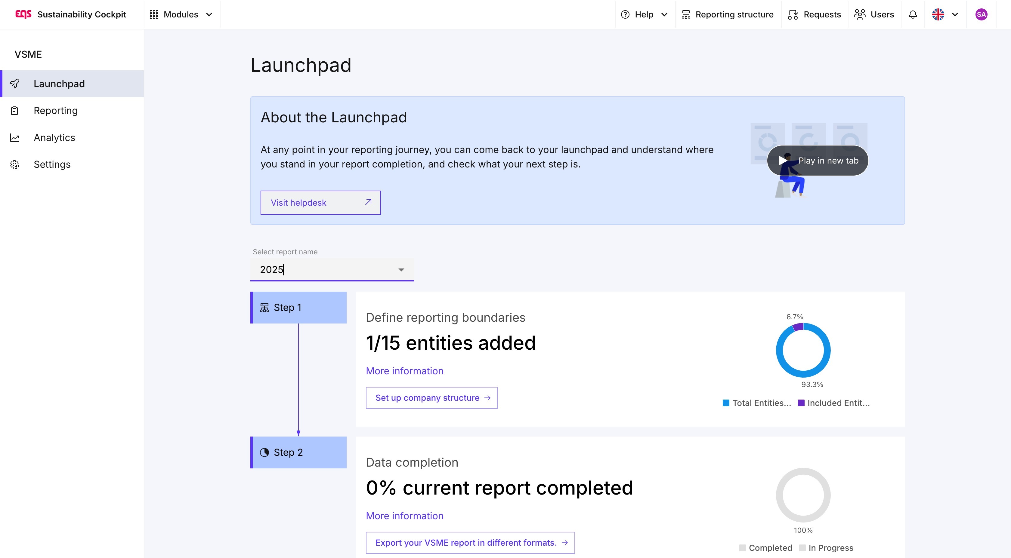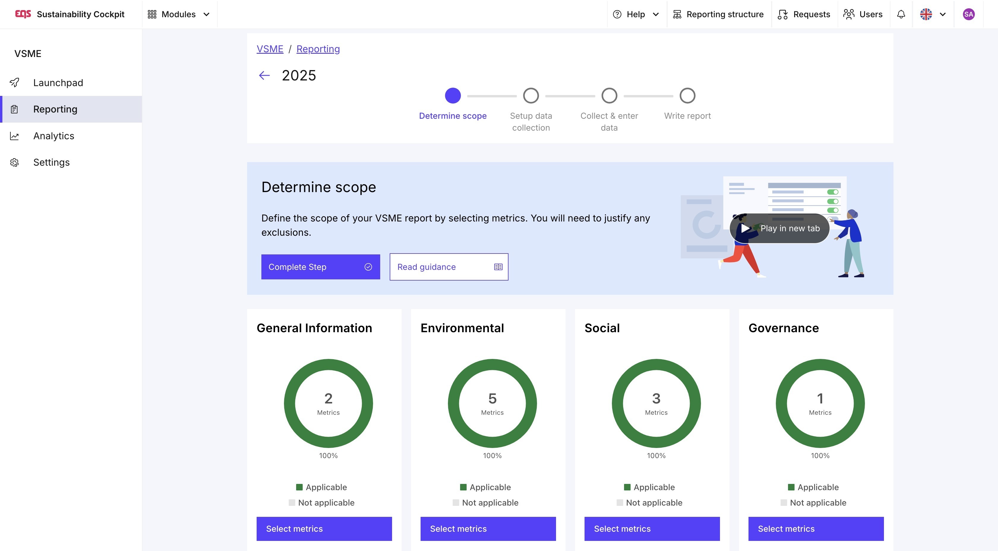 En el módulo VSME, le guiaremos a través de los distintos pasos para elaborar su informe de sostenibilidad con la ayuda de nuestra plataforma de lanzamiento. En el resto de este artículo, le presentaremos estos pasos. Aquí también puede ver cómo se estructura el módulo VSME dentro del EQS Sustainability Cockpit: