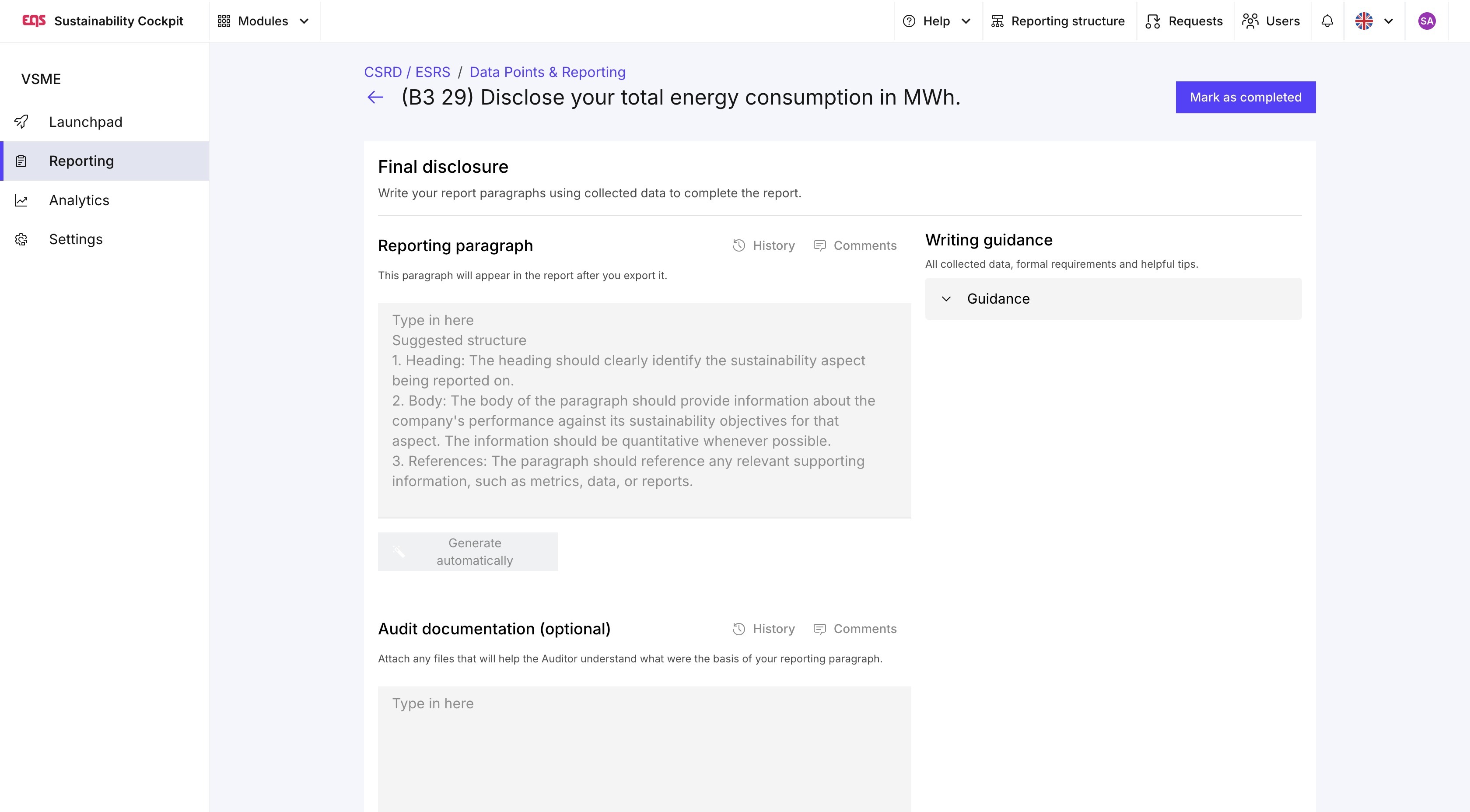 Ahora verá una tabla con todos los requisitos de divulgación, donde podrá crear los párrafos correspondientes para su informe. Para ayudarle, el Panel de Control de Sostenibilidad de EQS ofrece orientación, listas de verificación y soporte basado en IA para generar borradores de secciones del informe.