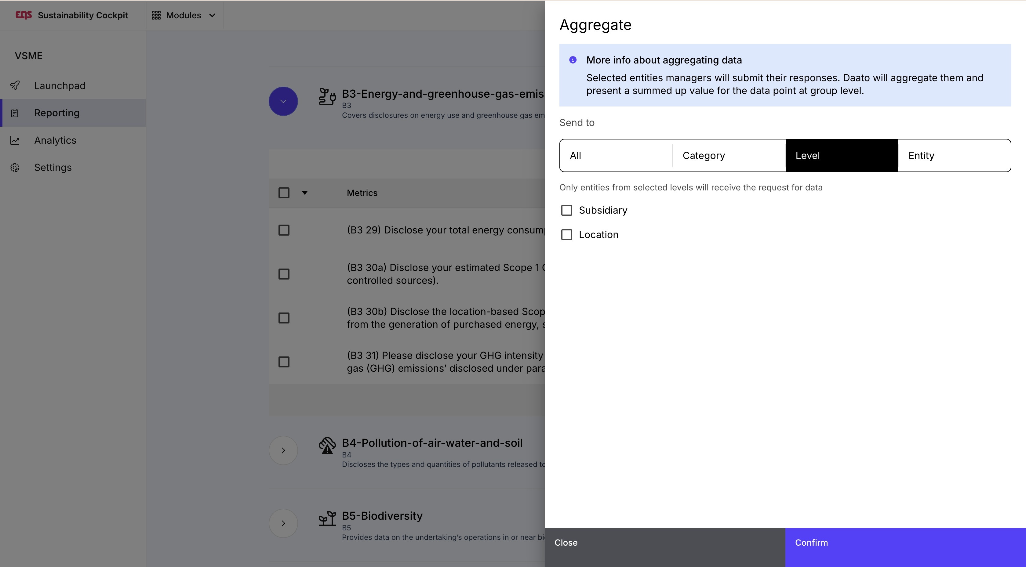 Para ello, la empresa informante debe definir el alcance del informe y decidir si preparará un informe consolidado o individual. Puede leer aquí cómo tomar esta decisión y su impacto en nuestro software. Le ayudamos a configurar su estructura organizativa, asignar responsables, crear definiciones comunes y configurar flujos de trabajo de aprobación. De esta forma, todos los datos de cada parte interesada se pueden recopilar de forma coherente con solo pulsar un botón.