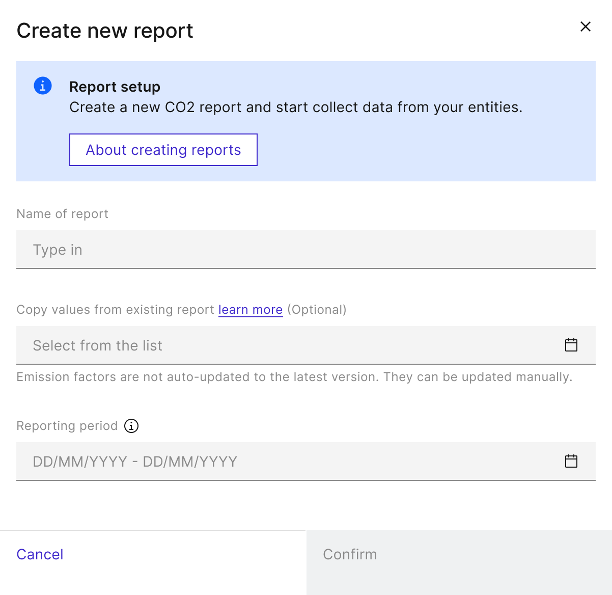 Para crear un informe de huella de carbono, haga clic en "Nuevo informe" . Se abrirá un cuadro de diálogo donde podrá seleccionar el año del informe, decidir si desea copiar los datos de un informe anterior y establecer el período del informe. La opción para agregar factores de emisión manualmente se ha trasladado a un paso posterior, después de seleccionar las actividades, para que el proceso sea más intuitivo.