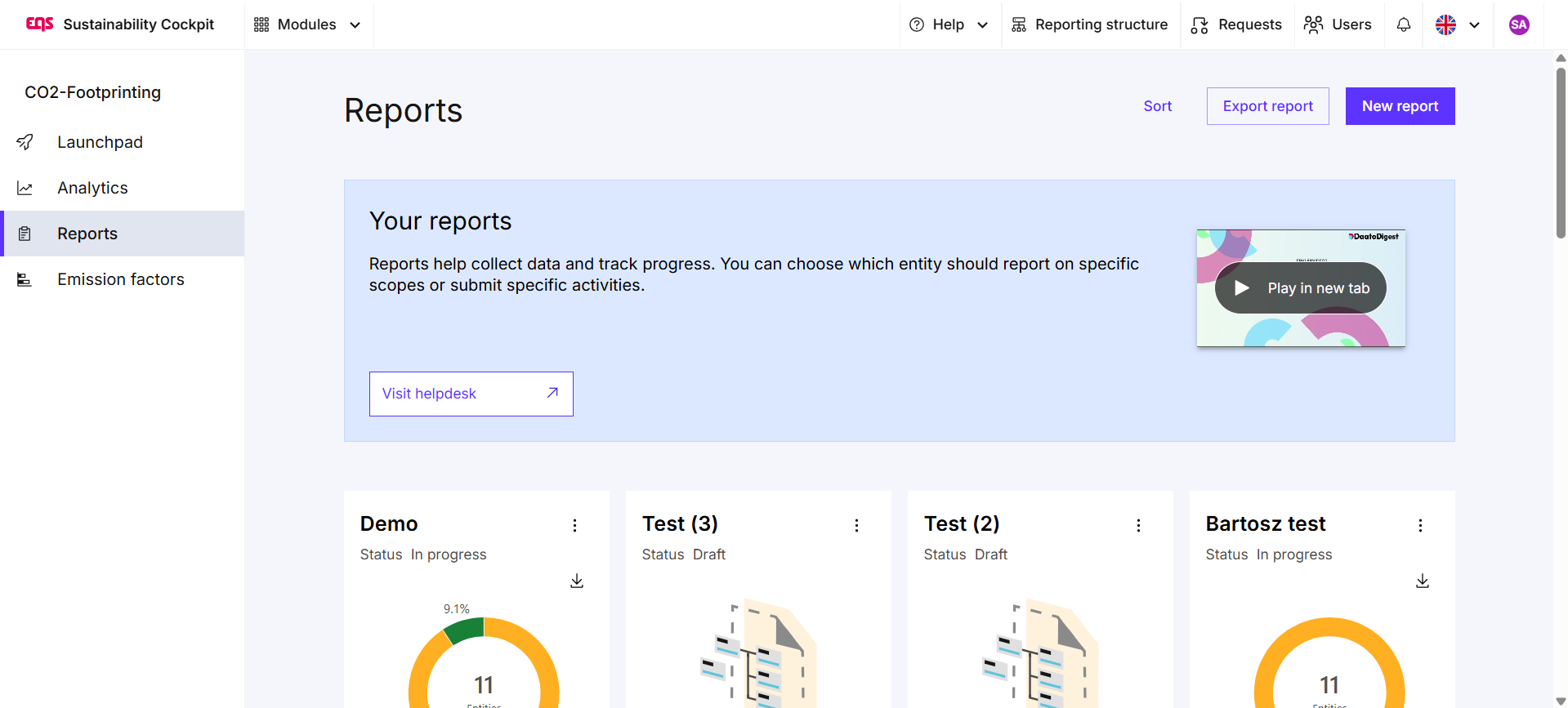 En el flujo de trabajo de CO₂ rediseñado del EQS Sustainability Cockpit, la antigua sección "Recopilación de datos" ahora aparece como "Informes". Desde esta página, puede crear nuevos informes, revisar los anteriores y exportar cualquier informe cuando lo necesite.