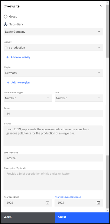 Saisissez ensuite le facteur d’émission lui-même, son unité de mesure, sa source et l’année de création ou d’enregistrement.