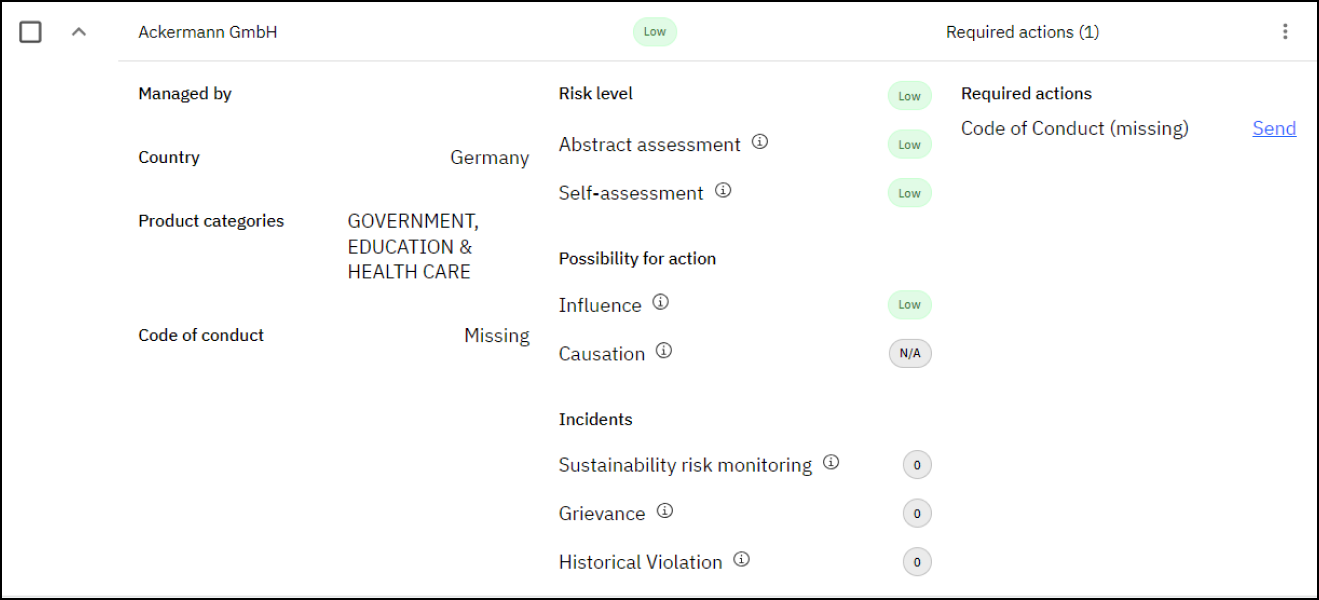 Chaque fournisseur et entité opérationnelle se voit attribuer un niveau de risque basé sur la combinaison de ses données produit et de son pays d’activité. Gardez à l’esprit que ce niveau de risque issu de l’évaluation abstraite sert d’indicateur pour mieux prioriser vos fournisseurs et répartir efficacement vos ressources.