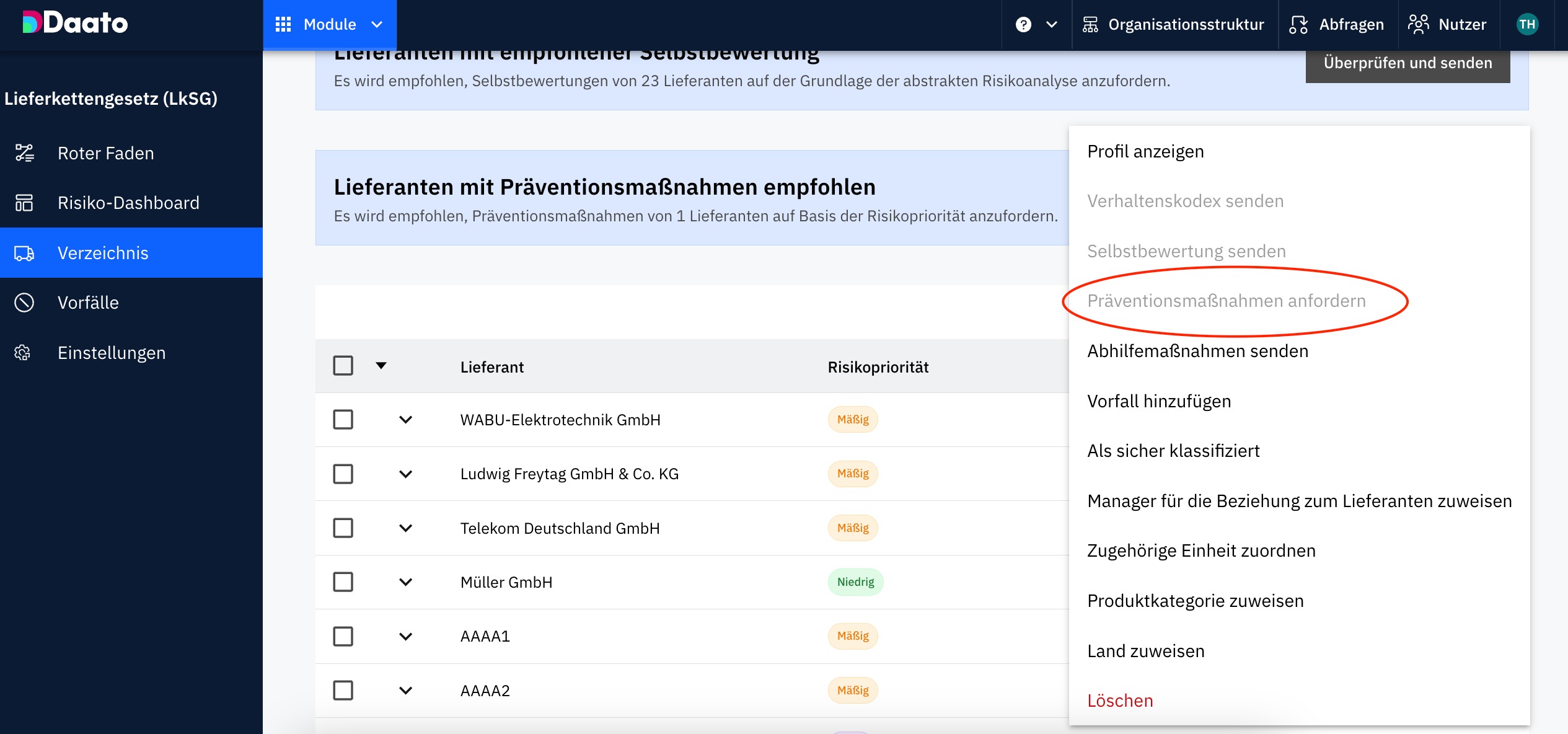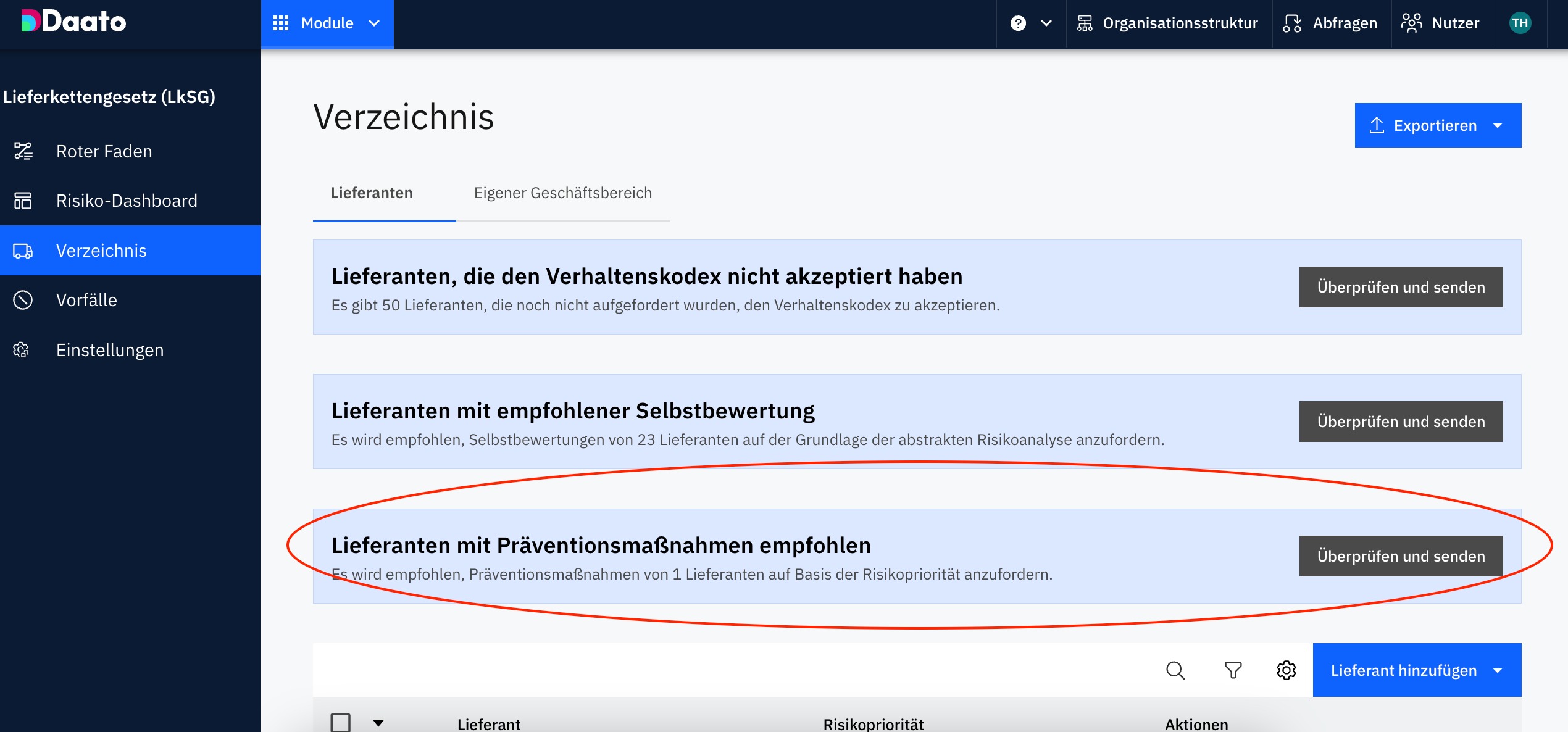 Outre la possibilité d'obtenir le consentement au Code de conduite, l'évaluation des risques spécifique sur Daato comprend l'auto-évaluation des fournisseurs. En collaboration avec Hogan Lovells, nous avons développé un questionnaire d'auto-évaluation à cet effet. Vous pouvez l'envoyer aux fournisseurs à haut risque afin de vérifier si les risques abstraits sont bien fondés ou si ces derniers ont mis en place des mesures pour les atténuer.
