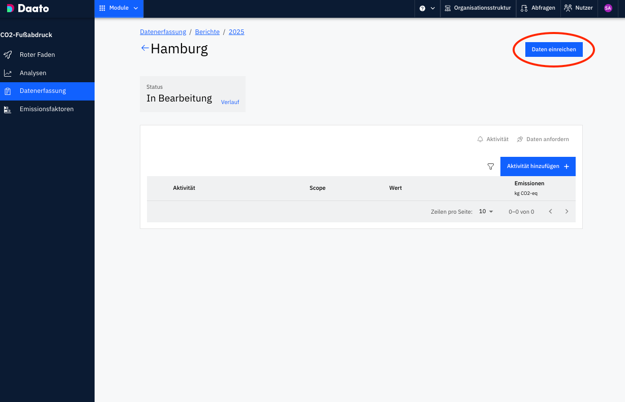 Pour inclure les données du siège, créez une entité au deuxième niveau de la structure organisationnelle et assignez-la à votre utilisateur. Vous recevrez alors une demande de données vous permettant de saisir les informations du siège, qui seront intégrées à l’agrégation globale
