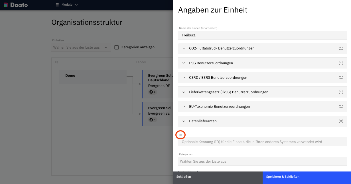 Ici, vous avez la possibilité, optionnelle, d’attribuer un identifiant propre à votre entreprise à votre unité. Celui-ci sera ensuite affiché sur la fiche de l’unité dans la structure organisationnelle.