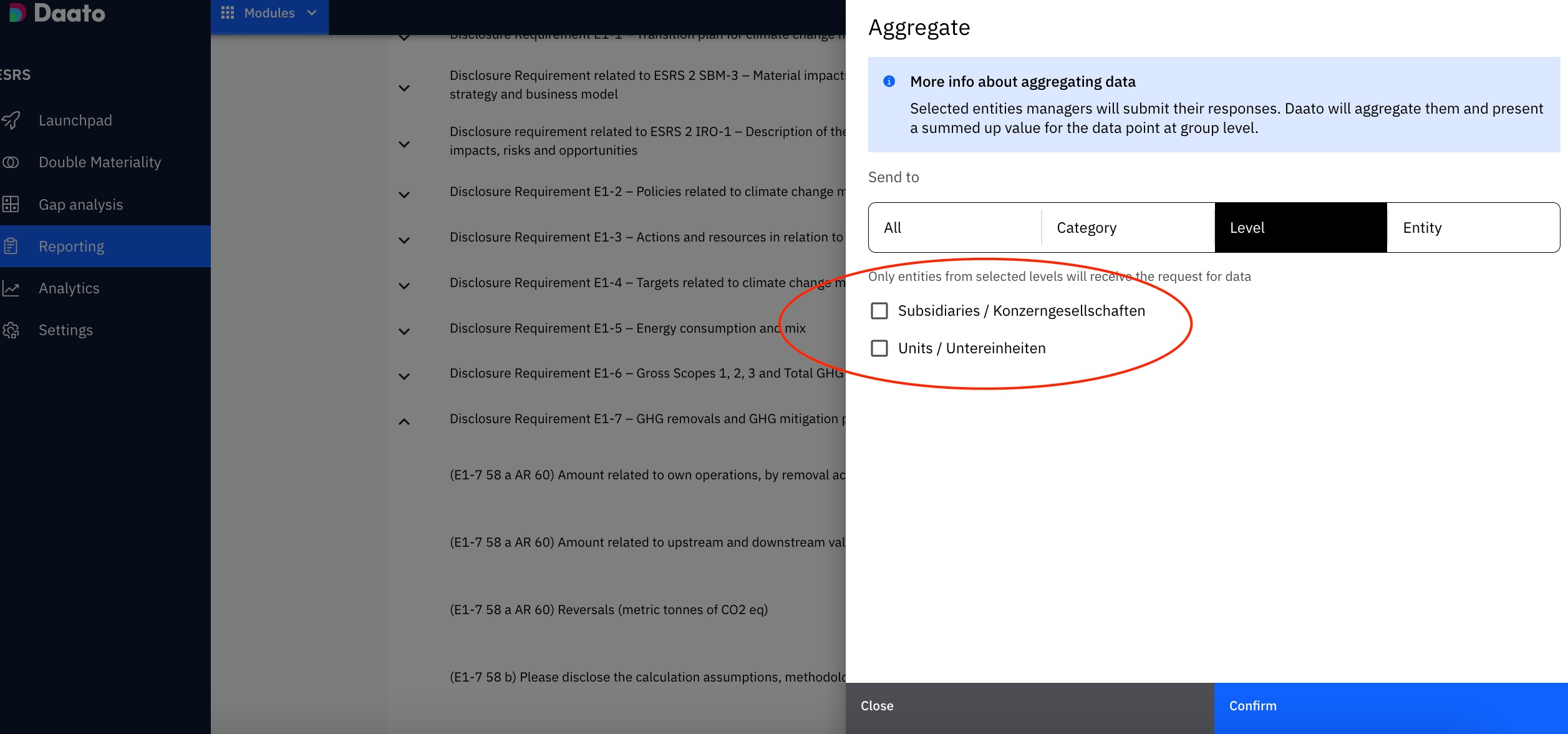 En revanche, si vous n’avez pas encore collecté les données environnementales dans l’ensemble de votre entreprise, vous utiliserez Daato pour collecter pour la première fois de nombreux indicateurs environnementaux dans toutes vos entités, et devrez donc recueillir des données (par ex. consommation d’énergie ou d’eau) non seulement auprès des filiales, mais aussi auprès des sites, afin que tous les apports soient agrégés en un seul total au niveau du groupe. Pour tous les points de données concernés, vous choisissez Agrégée et sélectionnez Unités / Sites: