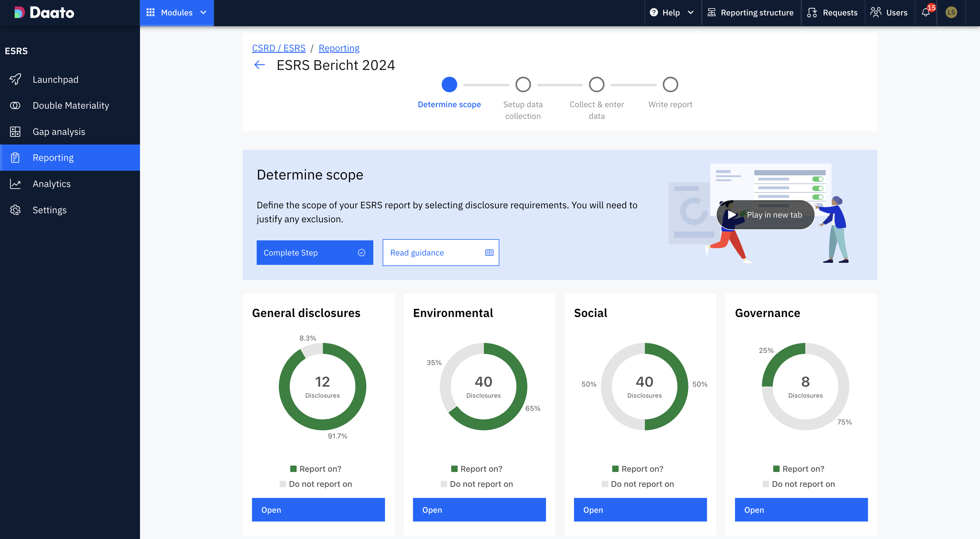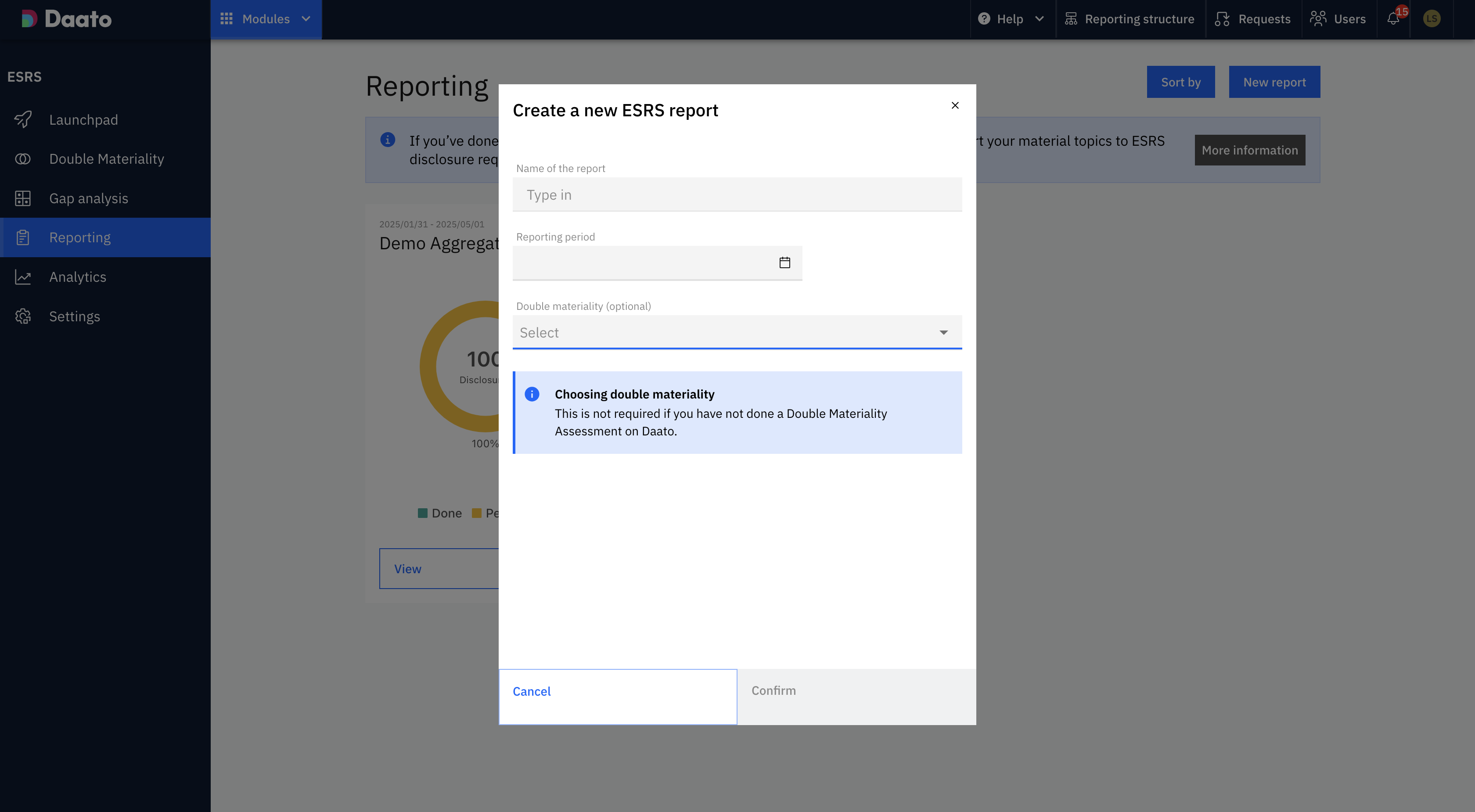 Si vous avez réalisé votre Double Materiality Assessment et/ou une Gap Analysis avec Daato, ou importé vos résultats dans Daato, vous pouvez les intégrer directement à votre processus de reporting. Vos données seront alors automatiquement transférées dans le workflow de reporting.