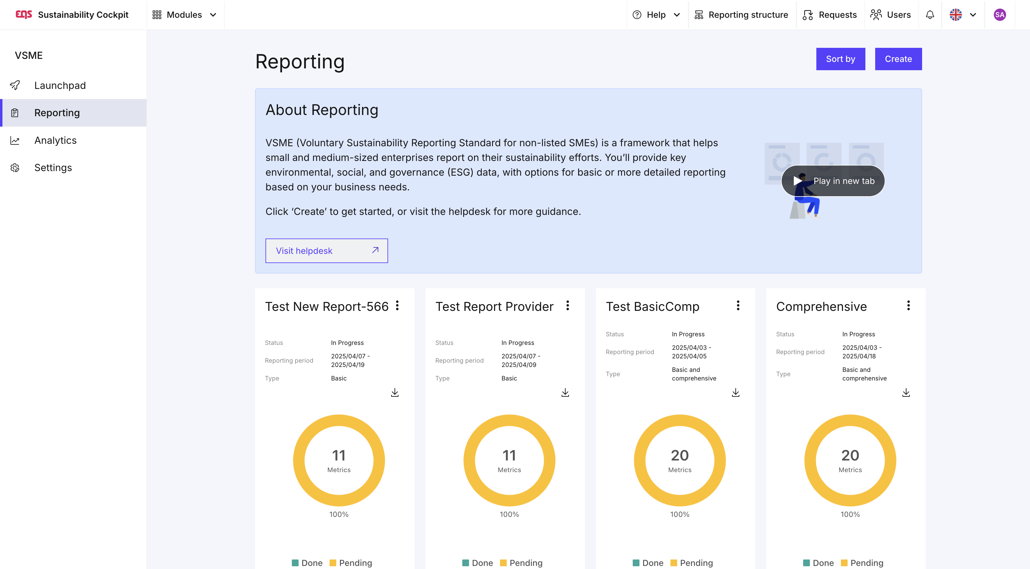 Pour créer un nouveau rapport dans votre module VSME, allez dans l’onglet Reporting du menu de gauche. Vous y trouverez vos rapports précédents et pourrez en démarrer un nouveau en cliquant sur Créer.