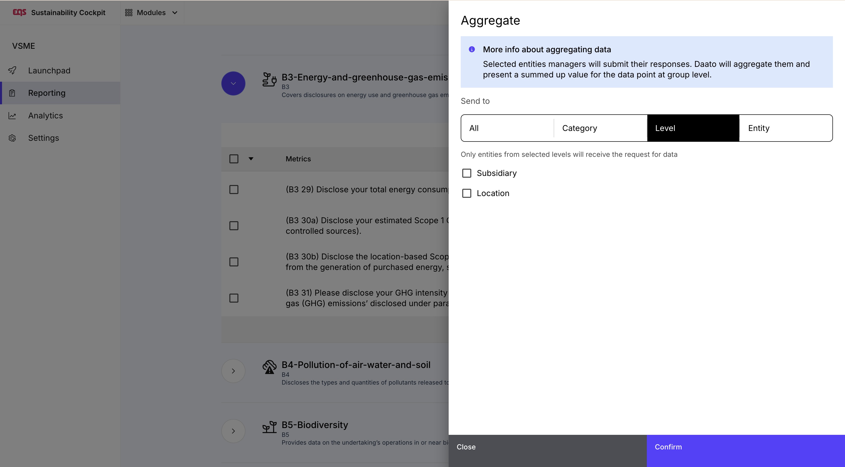 Cliquer sur « Agréger » permet de sélectionner différents cercles de consolidation, garantissant que les bonnes données sont envoyées au niveau approprié au sein de l'organisation.