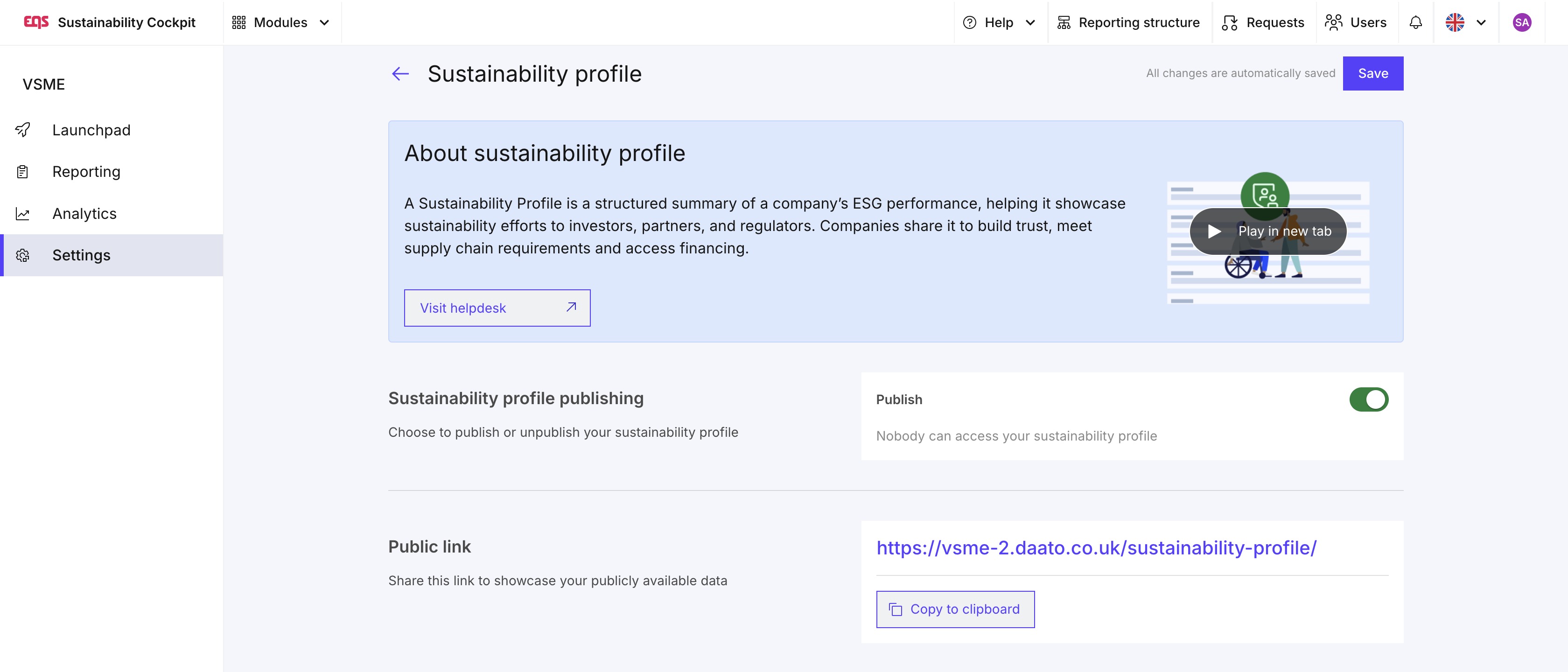Une fois votre rapport prêt, vous pouvez également partager vos données ESG clés en externe via le Profil de Développement Durable. Cette fonctionnalité vous permet de créer un profil public contenant des informations de développement durable sélectionnées, que vous pourrez ensuite partager avec des investisseurs, des partenaires commerciaux ou d'autres parties prenantes. Ce profil peut être intégré au site web de votre entreprise ou partagé via un lien public. De plus, les parties prenantes ont la possibilité de télécharger les rapports complets ou d'exporter les indicateurs clés de développement durable pour une analyse plus approfondie.