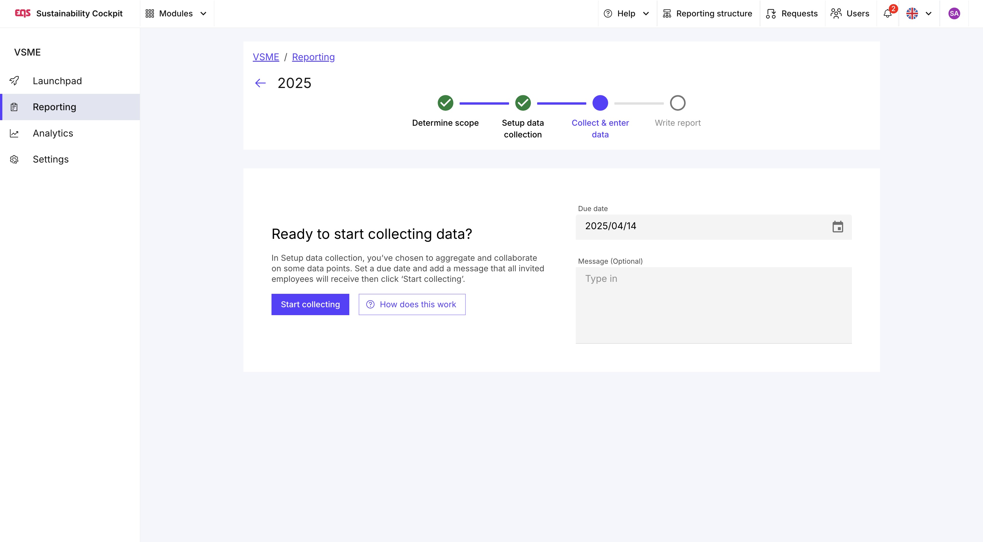 Dans ce qui suit, vous apprendrez à collecter des données dans le module VSME et à préparer votre rapport étape par étape.