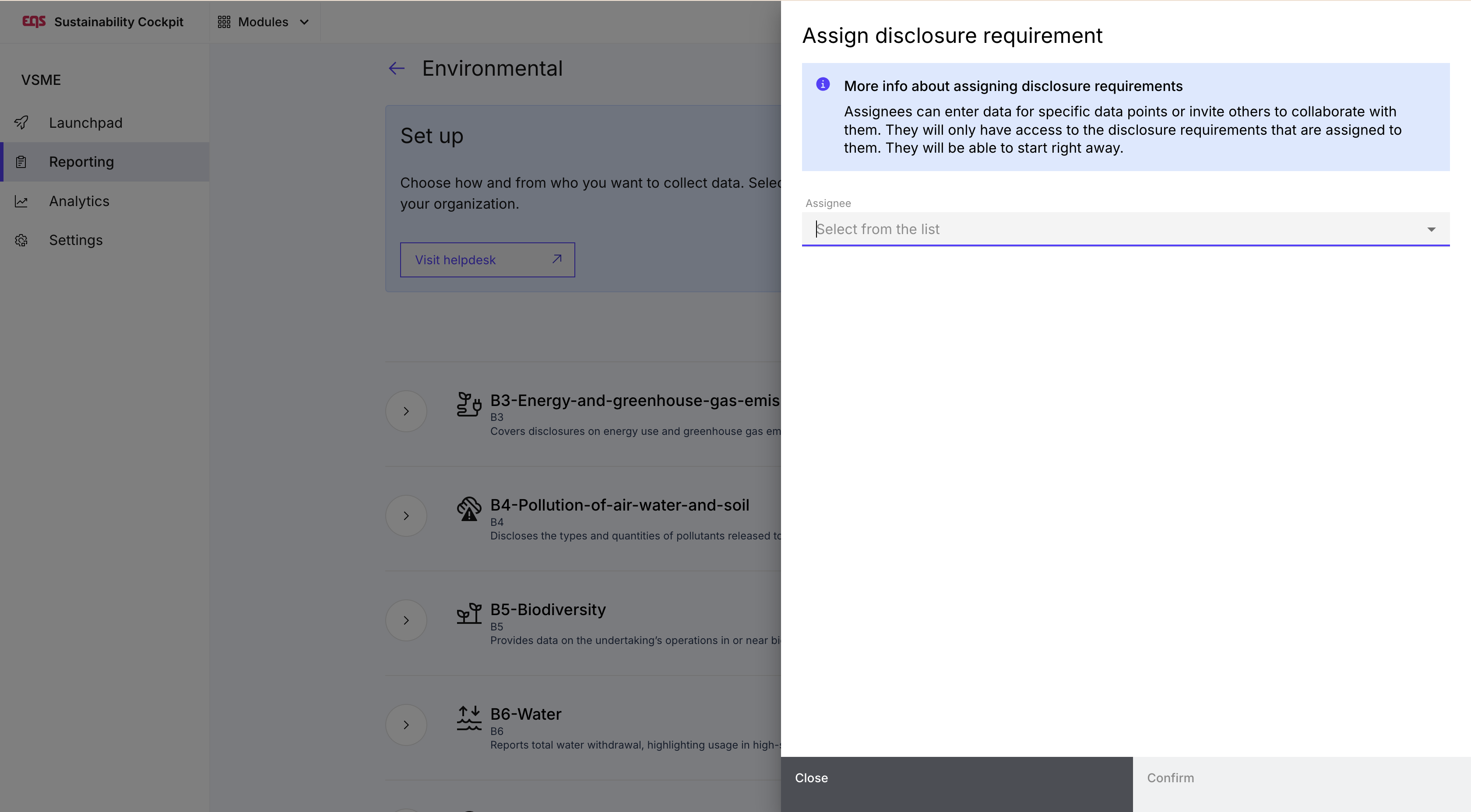 Dans le module VSME, vous pouvez attribuer des responsabilités pour chaque exigence de divulgation (« Disclosure Requirement » ou DR) afin de faciliter la collaboration et de garantir un processus de collecte de données efficace.