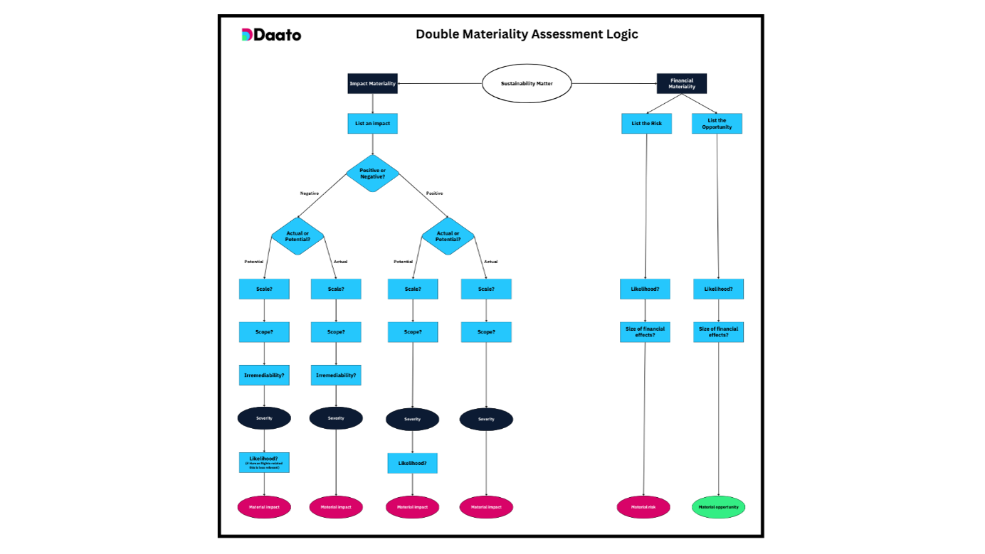 A Daato rendszerben történő kettős lényegességi értékelés folyamata az ESRS szabványokon és az EFRAG által kiadott „Implementation Guidance for the Double Materiality assessment” dokumentumon alapul. A cél az, hogy a vállalatok képesek legyenek a kulcsfontosságú témák értékelésére a hatások, kockázatok és lehetőségek szempontjából, valamint belső és külső érintettek bevonásával. Az alapot az ESRS AR 16-ban meghatározott lényeges témák listája adja, ugyanakkor a vállalatok hozzáadhatnak egyedi, cégspecifikus témákat is. A folyamat eredménye egy átfogó kép az összes lehetséges vállalati hatásról a környezetre („inside-out” nézőpont), valamint a környezet hatásáról a vállalatra („outside-in” nézőpont).