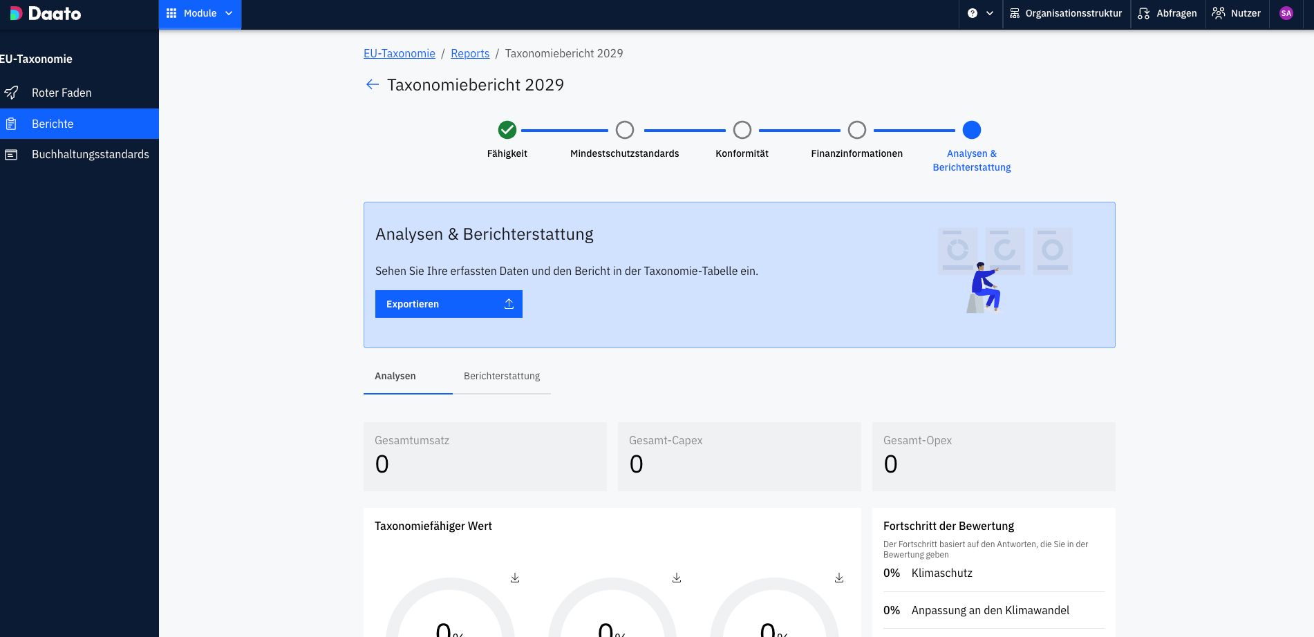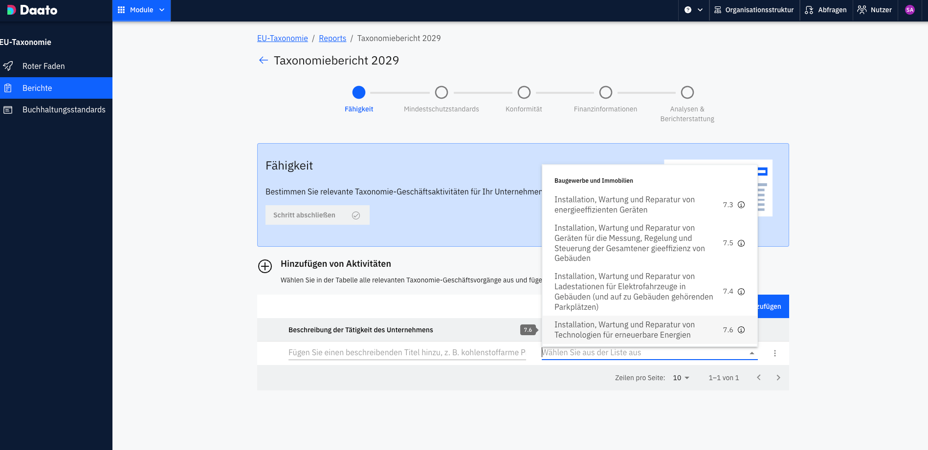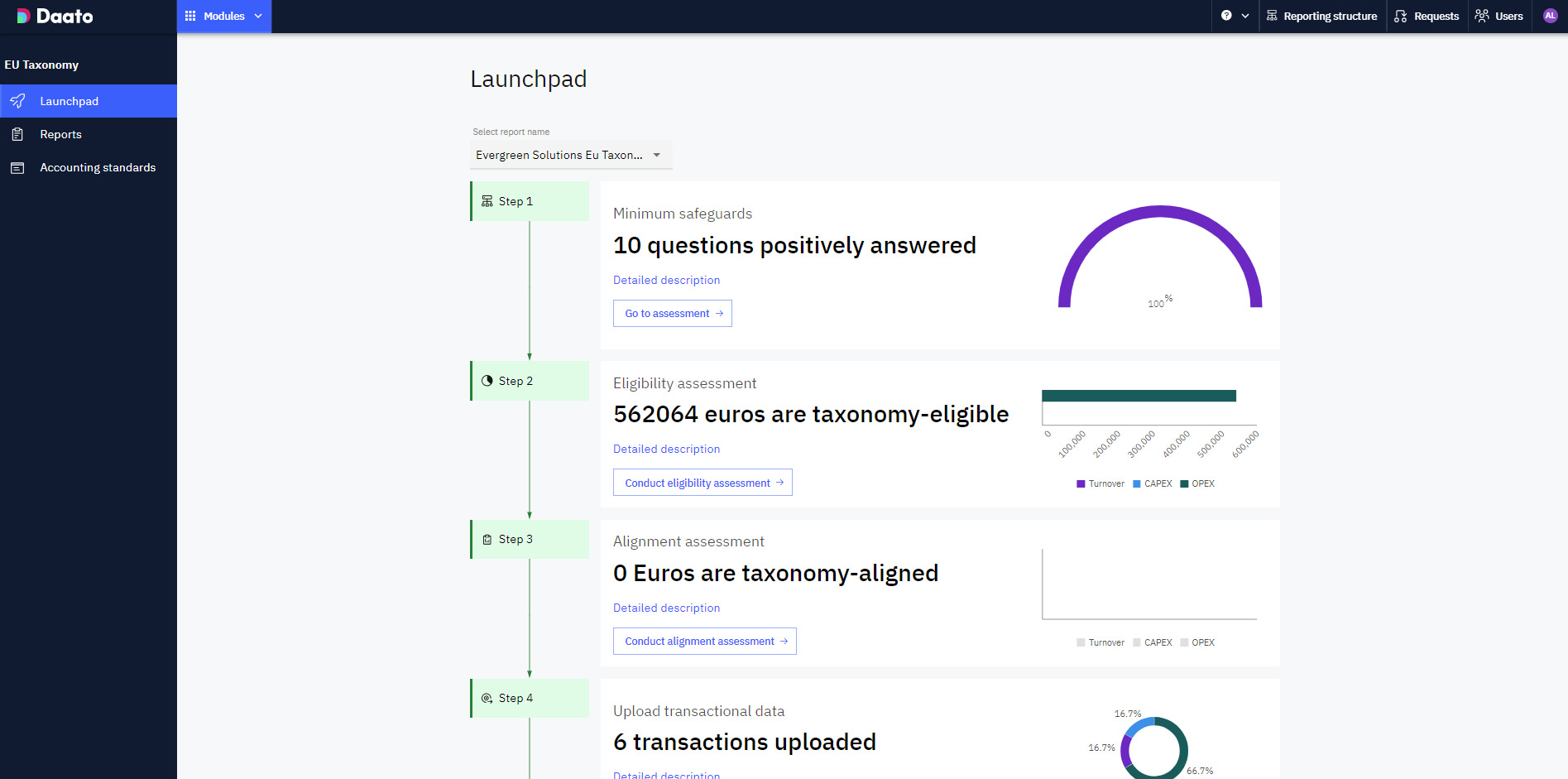 Amint hozzáadta a teljes vállalat pénzügyi adatait, valamint a tevékenységeket és altevékenységeket, a Daato automatikusan kiszámítja a taxonómiai jogosultságát és megfelelőségét a háttérben.