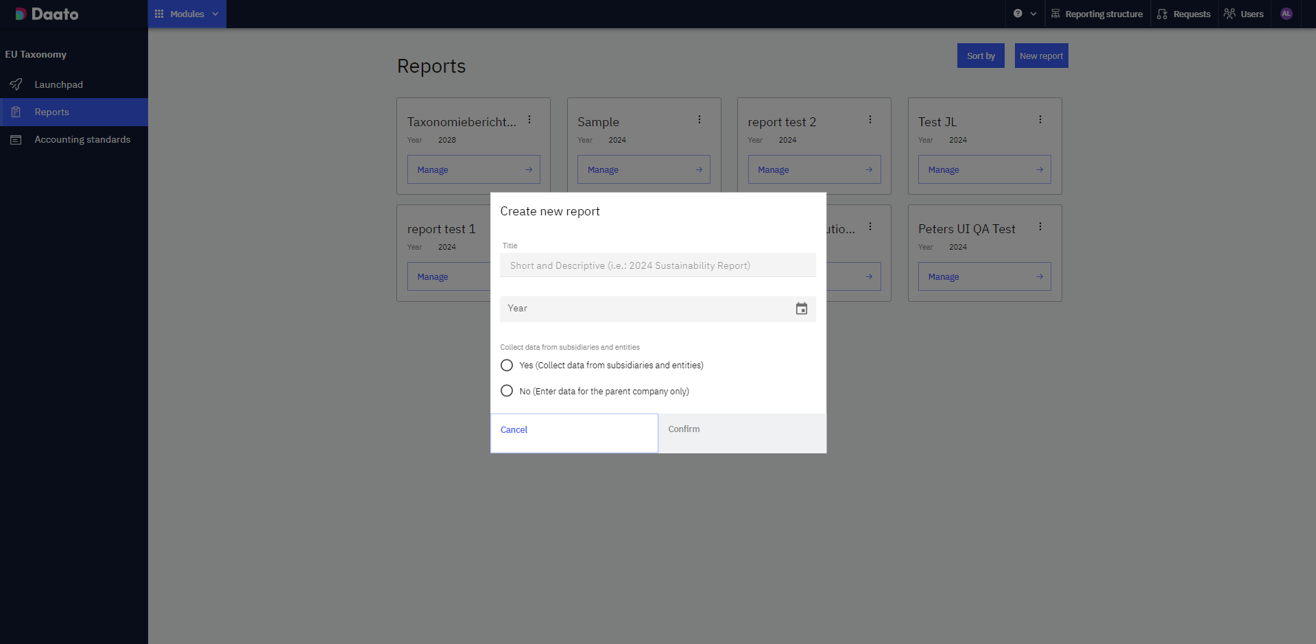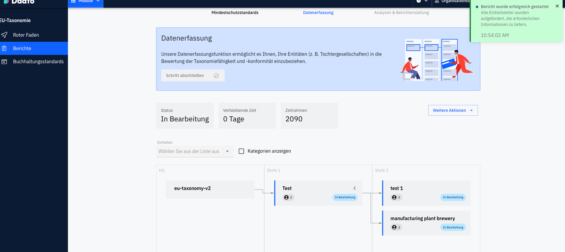 A leányvállalatok ezután látni fogják a fent leírt, az anyavállalat szintjén leírandó munkafolyamatot, amely során meghatározzák a taxonómiára jogosult tevékenységeket, felmérik a megfelelőséget, hozzáadják a pénzügyi adatokat, és visszaküldik az adataikat Önnek .