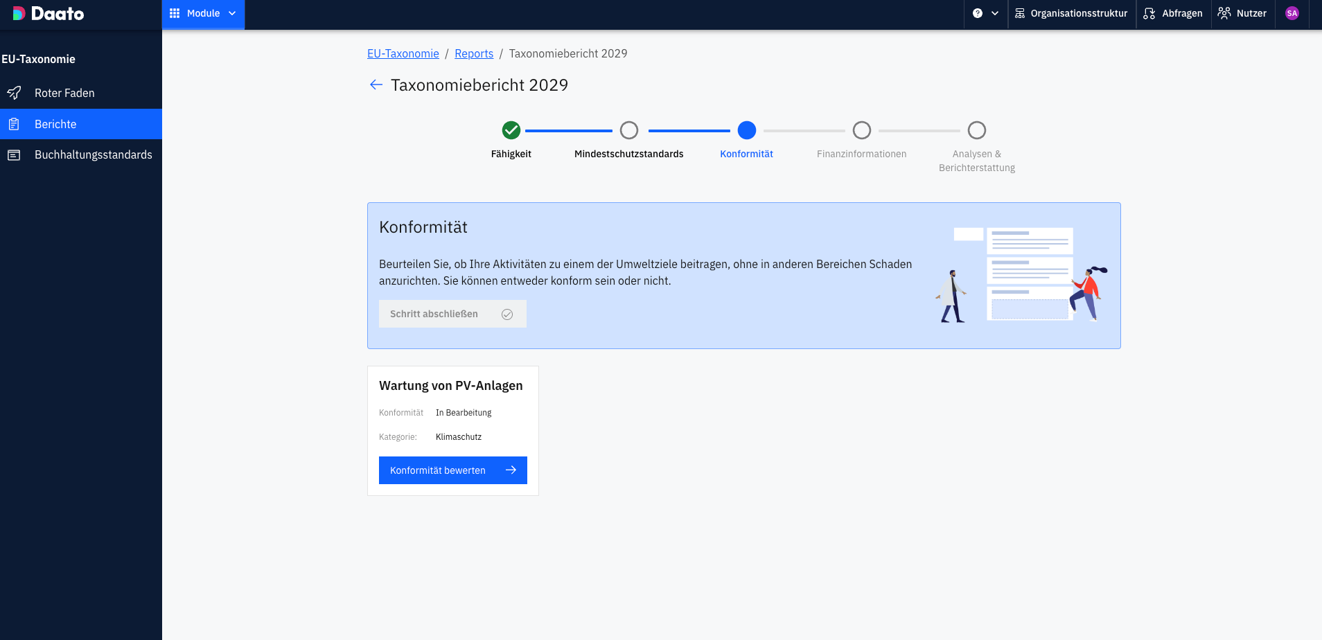 Mindkét kérdés értékelhető számos, a Taxonómiai Rendeletből és annak felhatalmazáson alapuló jogi aktusaiból származó összetett kritérium alapján. A Daato ezeket a kritériumokat felhasználóbarát kérdések formájában fogalmazta meg, lehetővé téve mindkét szempont egyszerűsített módon történő értékelését. Mindeközben folyamatosan láthatja, hogy a válaszai hogyan befolyásolják a taxonómiai megfelelőség értékelését – például, hogy egy adott válasz miatt továbbra is összhangban vannak-e, vagy már nem. Dokumentumokat is feltölthet bármikor, pl. elismervényként, és továbbíthatja a kérdéseket a kollégáknak .