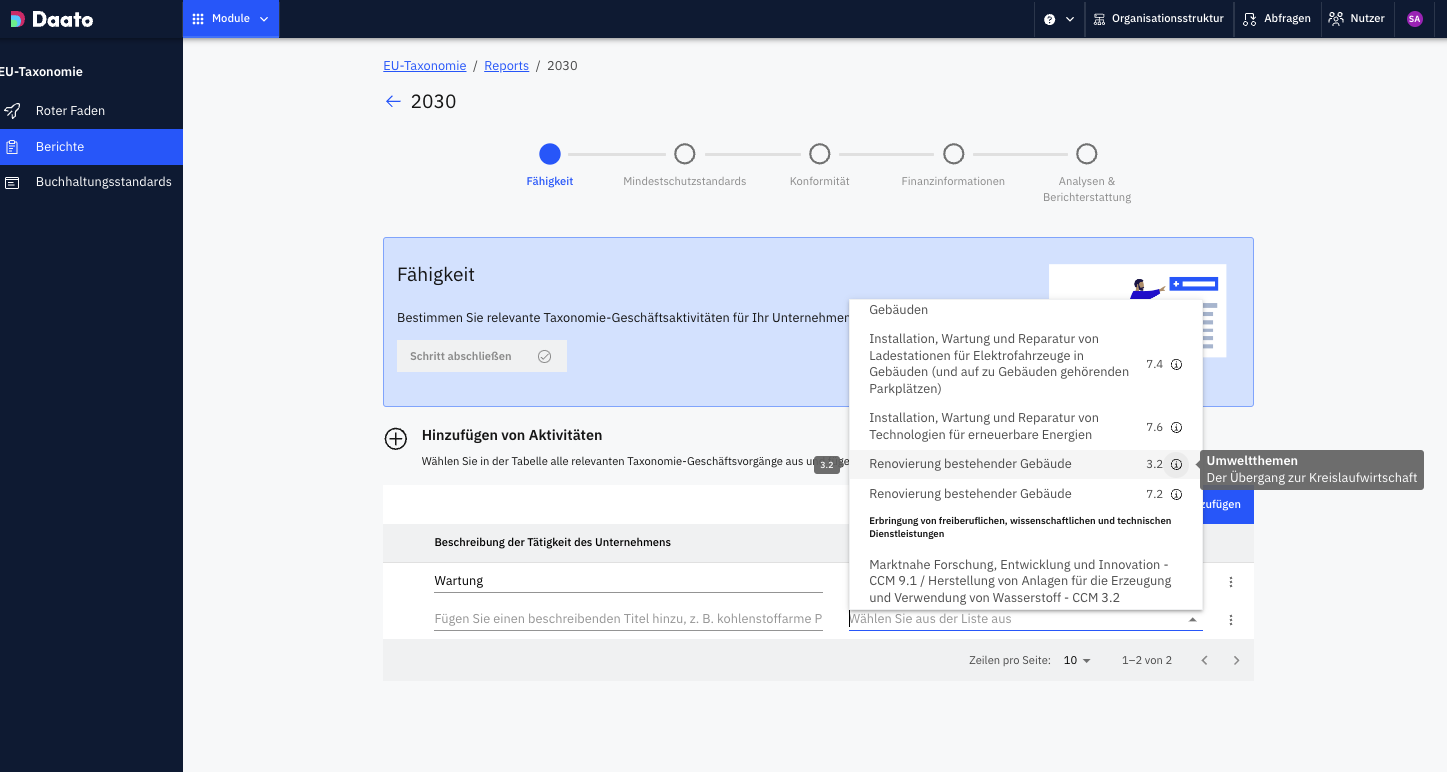 A Daato szoftver Taxonómia listájában egyszerűen kiválaszthatja az Önre vonatkozó tevékenységeket.